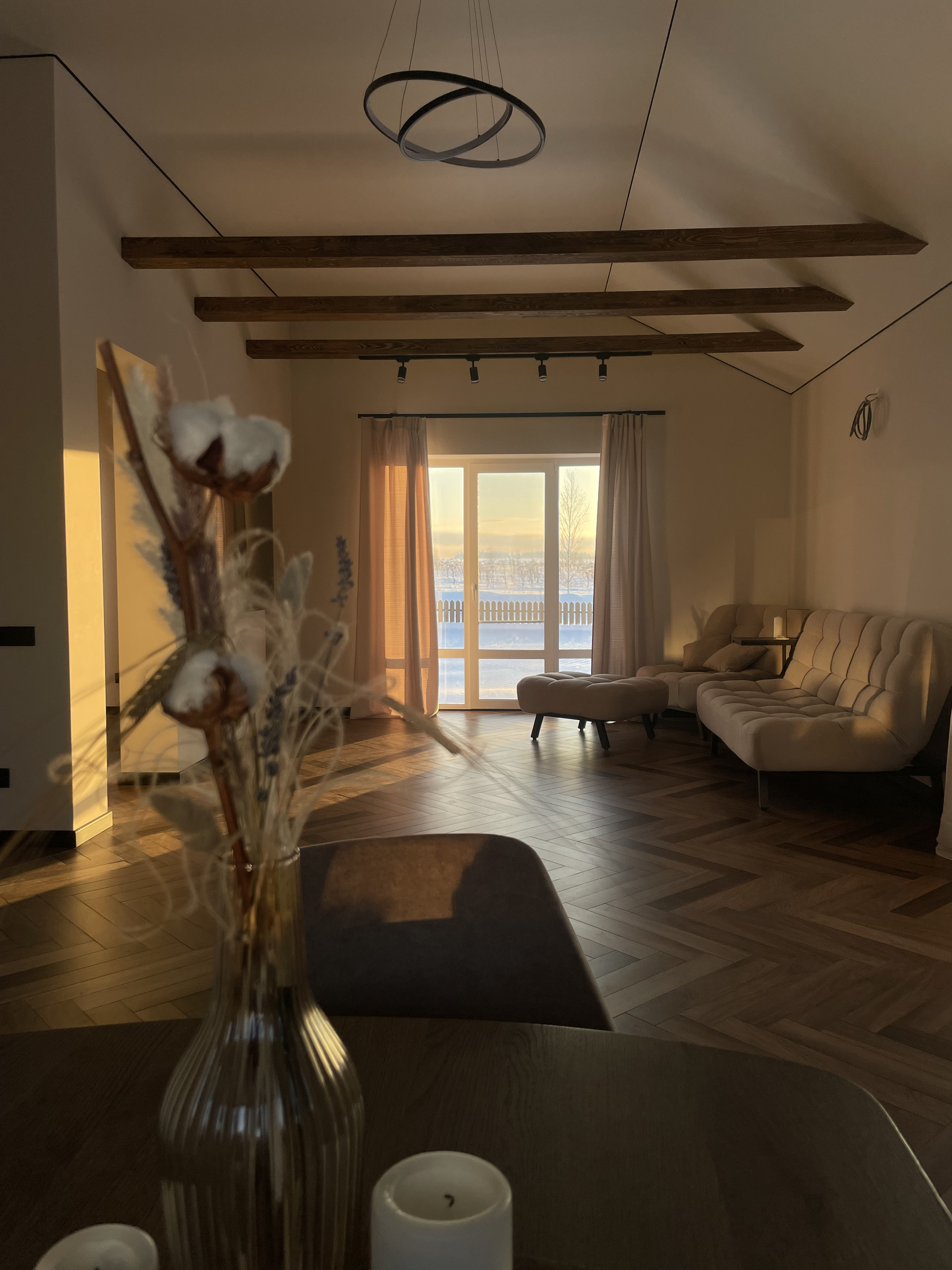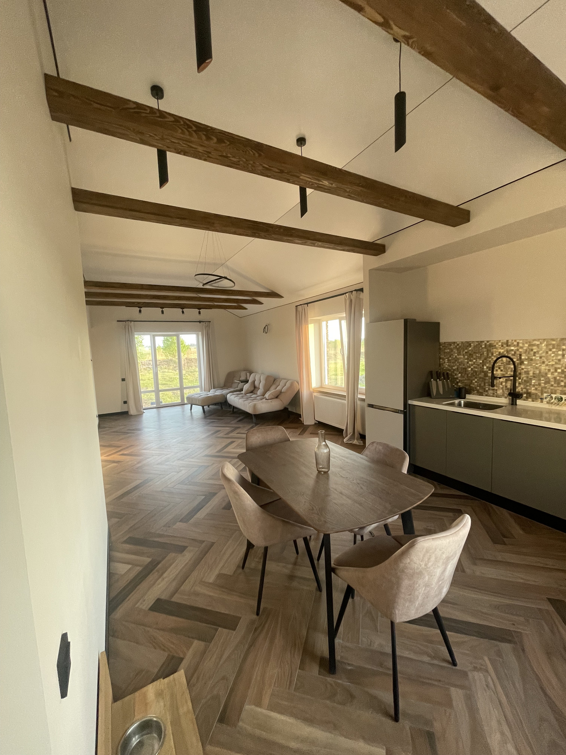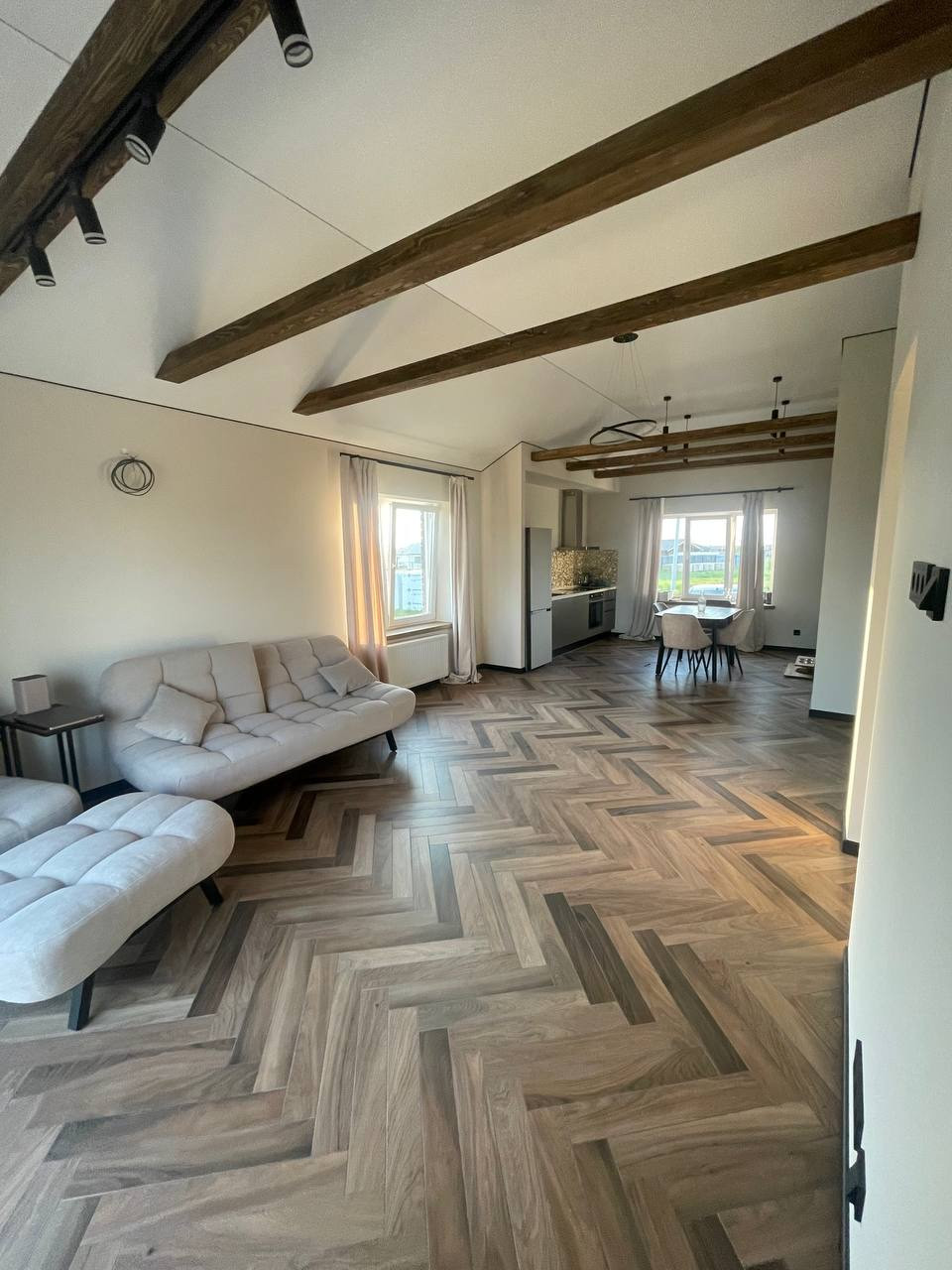 Дом выполнен в скандинавском стиле, нету личных следов проживания, вся отделка под покраску (штукатурка, шпаклевка, стеклохолст и т. д.), финская краска, никаких трещин после двух зим, деревянные интерьерные балки, деревянные подоконники. Керамогранит высокого качества по всему дому, уложен елочкой. Кухня с фасадами, покрашены с двух сторон, немецкая фурнитура, столешница из искусственного камня. Двери, дверные коробки, откосы и плинтуса выполнены в один цвет от одного производителя. Вся электрика немецкая, больше 40 розеток по всему дому, есть скрытые розетки в стенах для hdmi кабелей. По всему дому можно выбирать температуру света. Реализована удобная система хранения. Также предусмотрены выводы под кондиционер и кухонный остров.