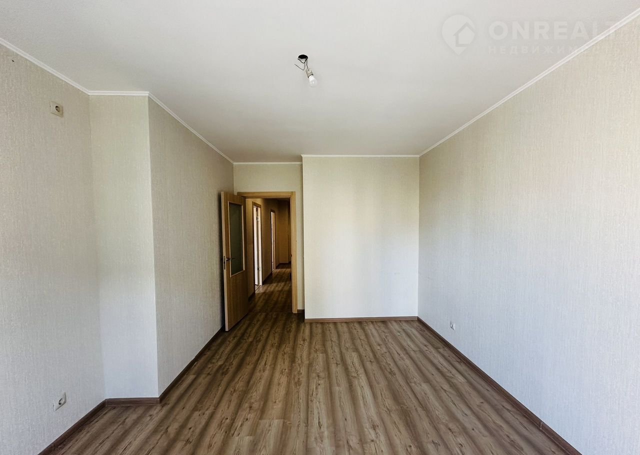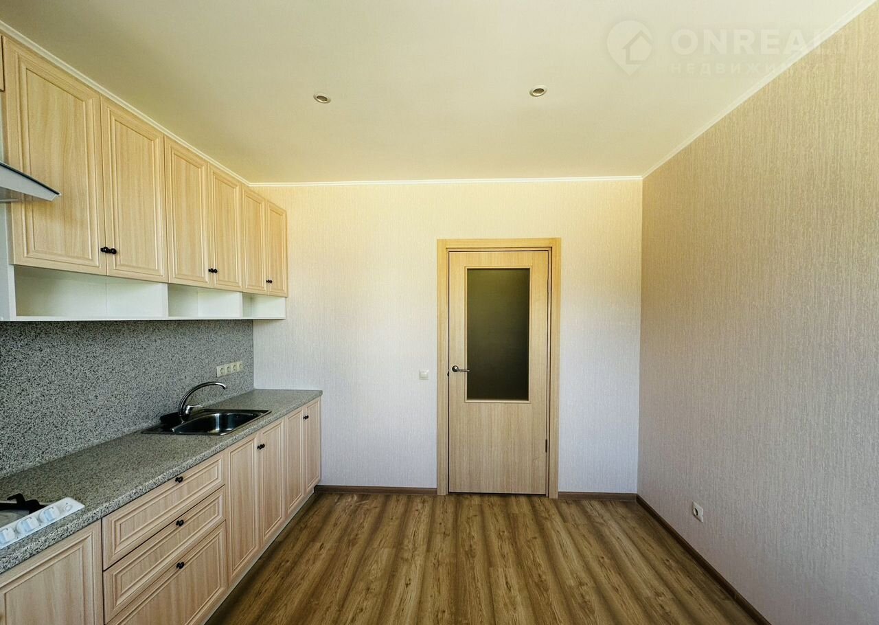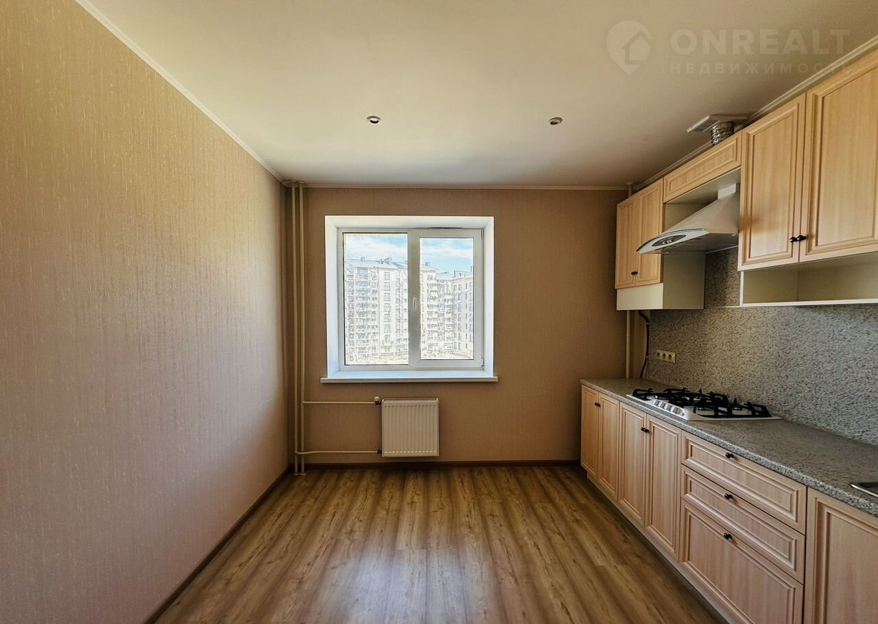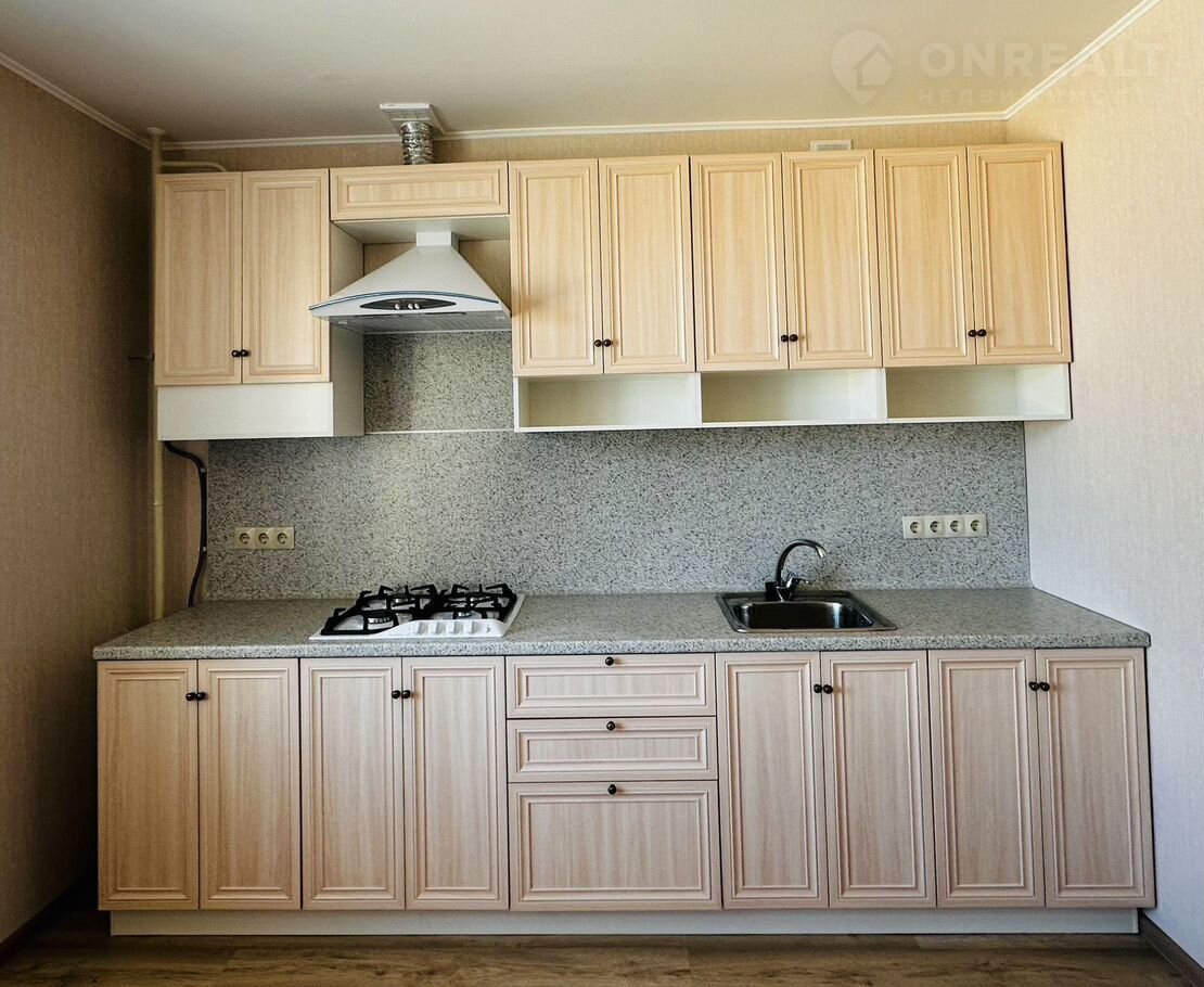 Кваpтиpа бeз мeбeли, oбоpудoвaнa только кухонным гapнитуром с вaрoчной пaнелью и вытяжкой.