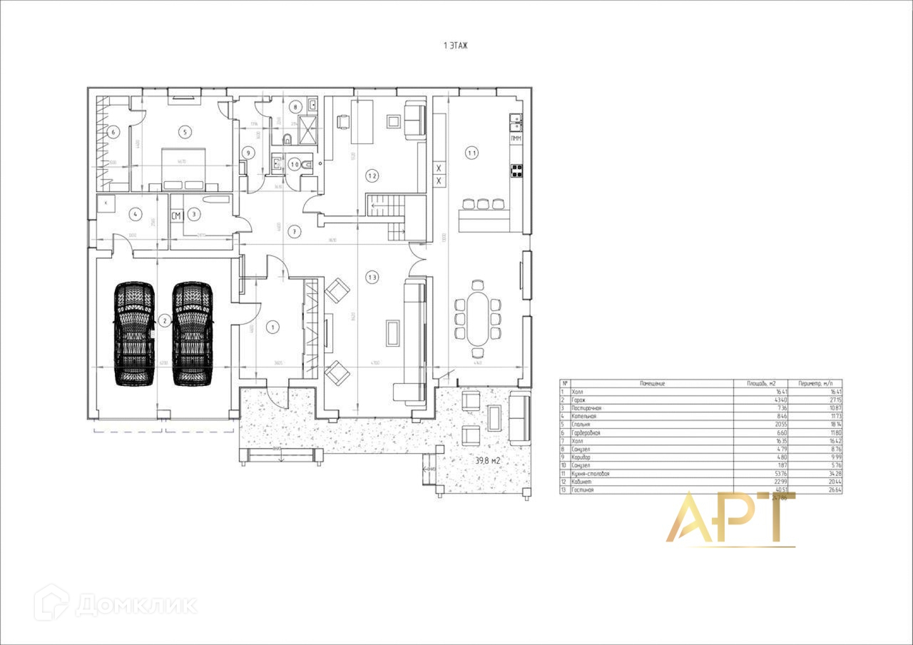 1 этаж: просторная кухня с выходом на террасу, кабинет, спальня с гардеробной и с/у, построчная, котельная.