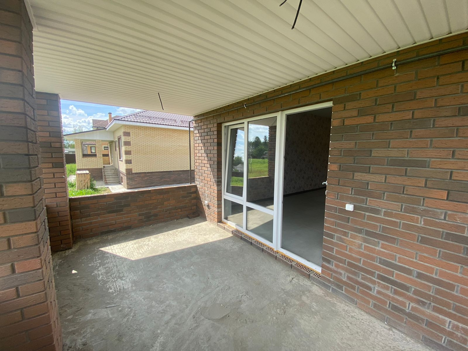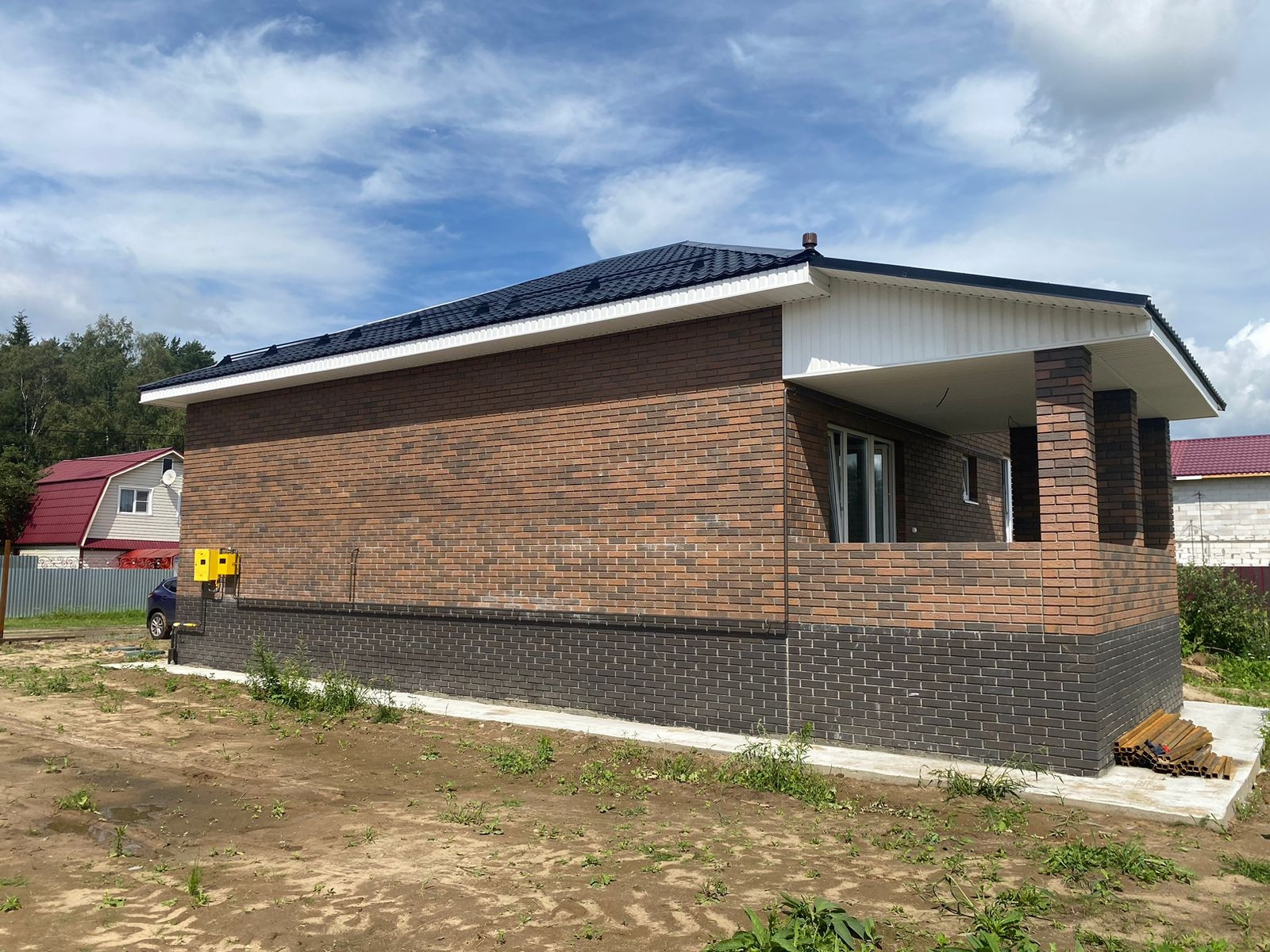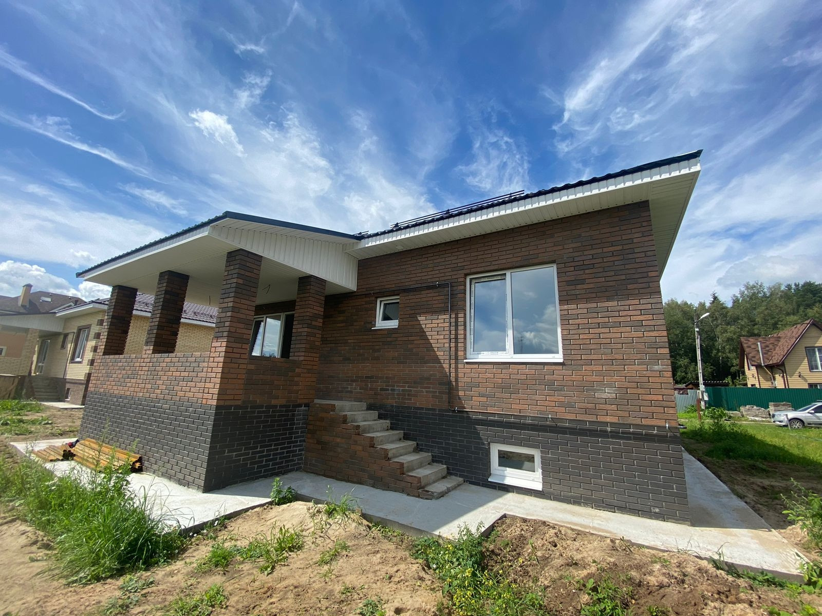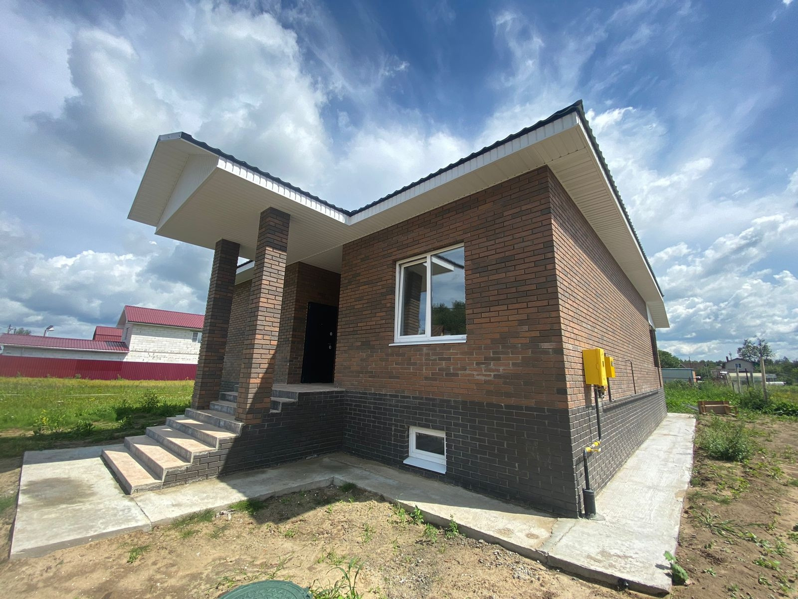 Дом новый. Построен из газобетонных блоков, облицован кирпичом. Фундамент ленточный, перекрытие ж/б плита. В доме 3 комнаты, кухня-гостиная с выходом на просторную веранду, с/узел и гардеробная. Сделан отдельный вход в техническое и подвальное помещение, которое расположено под всем домом.