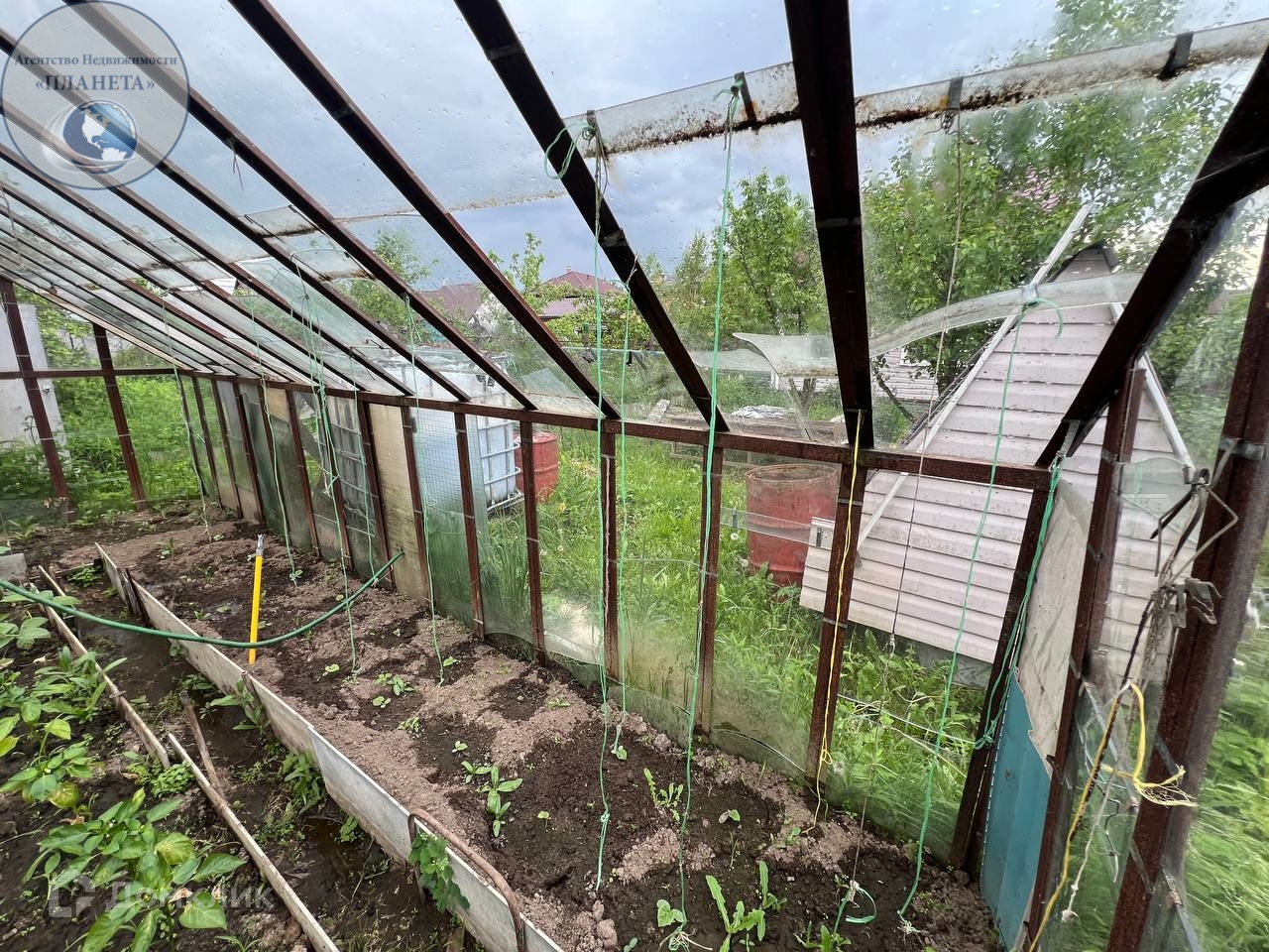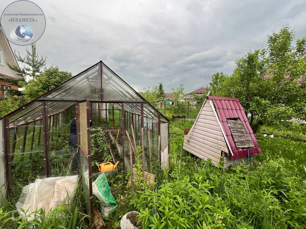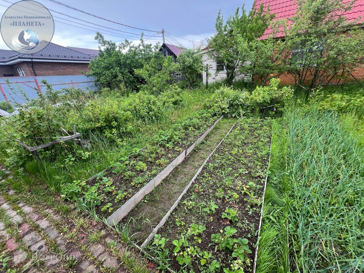 На участке расположены колодец,зона барбекю, летний душ,теплица,хозблок,плодовые деревья. Место для машины и дорожки выложены брусчаткой.