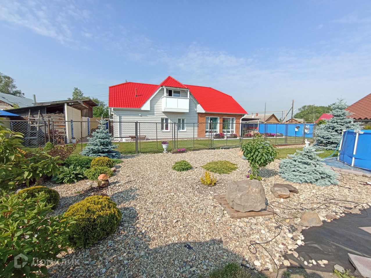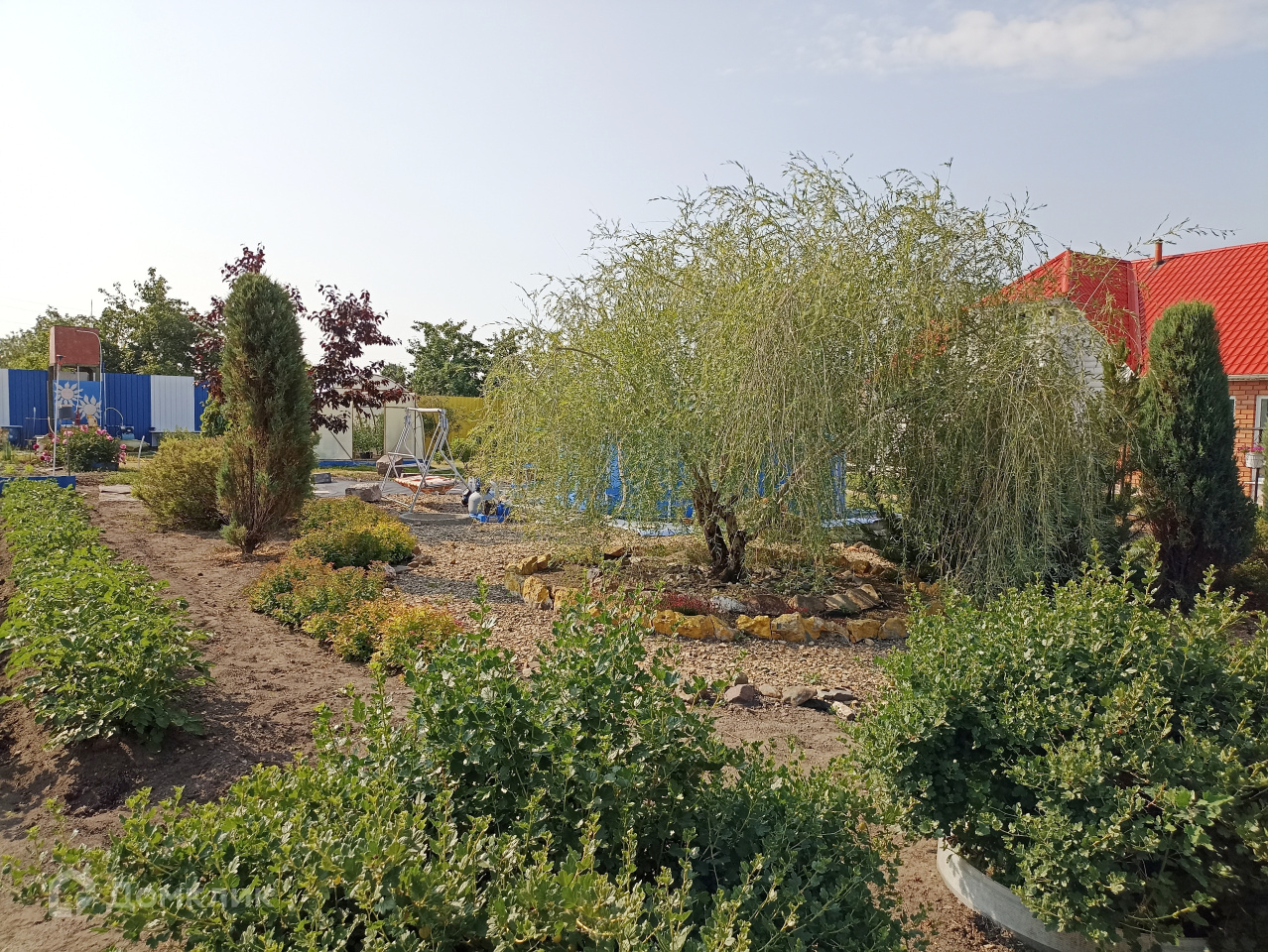 На участке саженцы из питомников: разнообразные ели, можжевельники, спиреи, плакучая ива, красная яблоня, всё нереальной красоты. На той территории, где ели, всё закрыто нетканым материалом и речной галькой, галька промыта, поэтому эта территория прополки не требует, остается только наслаждаться красотой!!! Ваши гости оценят ваш новый дом, где можно покупаться и пожарить шашлыки.