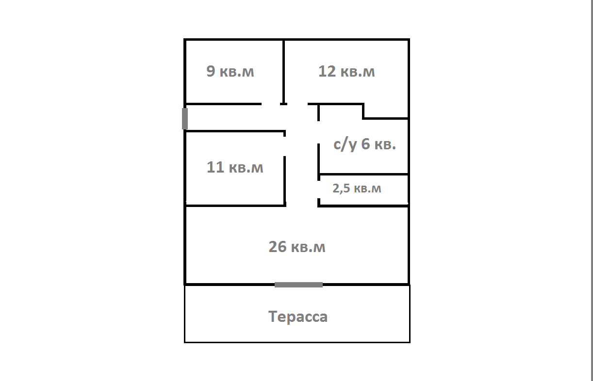 Общая площадь 90кв.м., кухня-гостиная с выходом на терасу 26 кв.м, комнаты 10,5 + 12 + 9,5 кв.м, сан/узел совмещенный 6 кв.м.