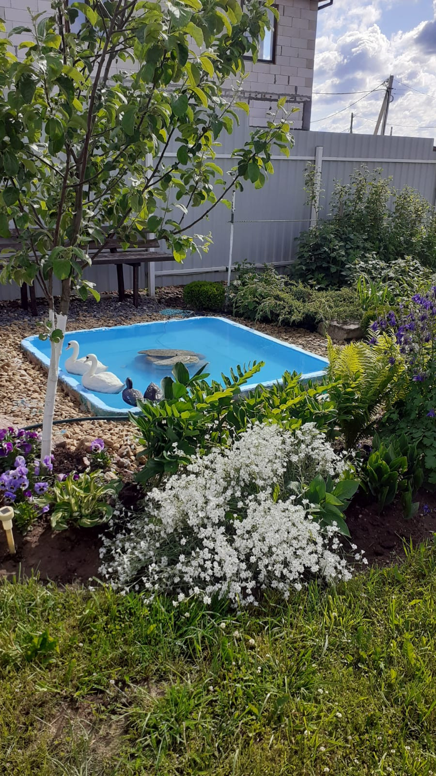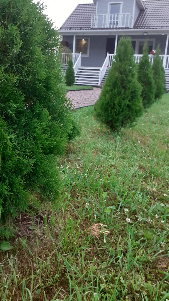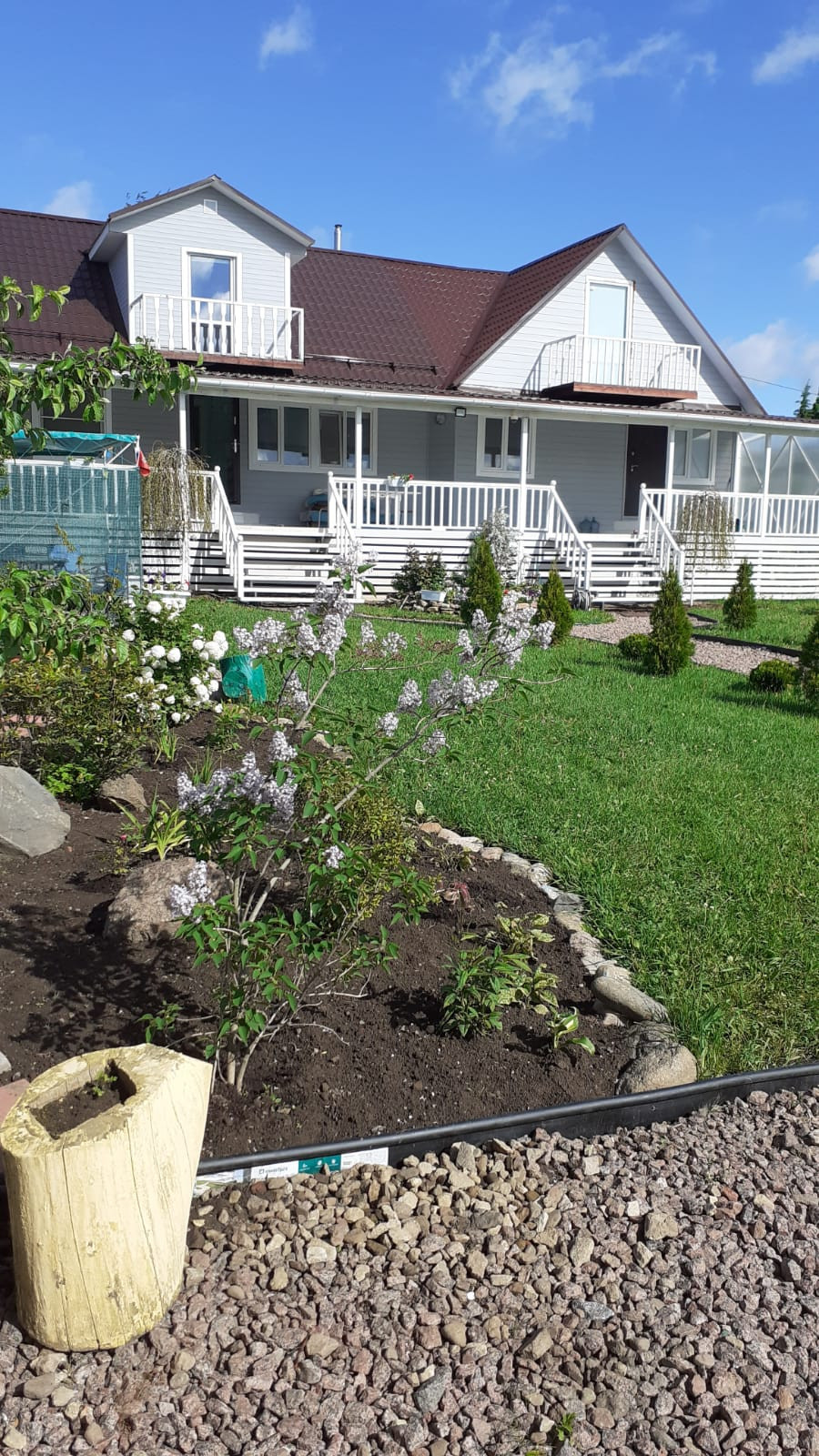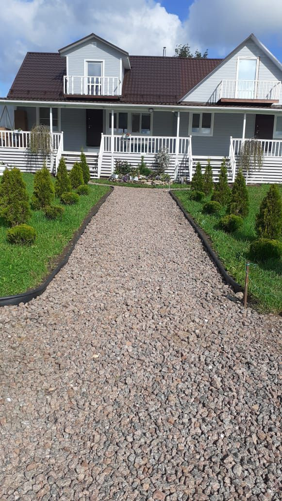 Участок очень красивый, огорожен забором, произведены ландшафтные работы, высажены туи, сосны, декоративный пруд, плодовые деревья и кустарники, разбиты клумбы с цветами. Паковочная зона и гараж под два автомобиля.