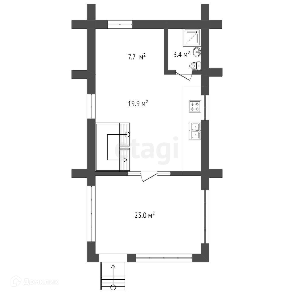Двухэтажный дом из кедра с террасой, кухней-столовой, гостиной и с/у на первом этаже и спальней на втором.