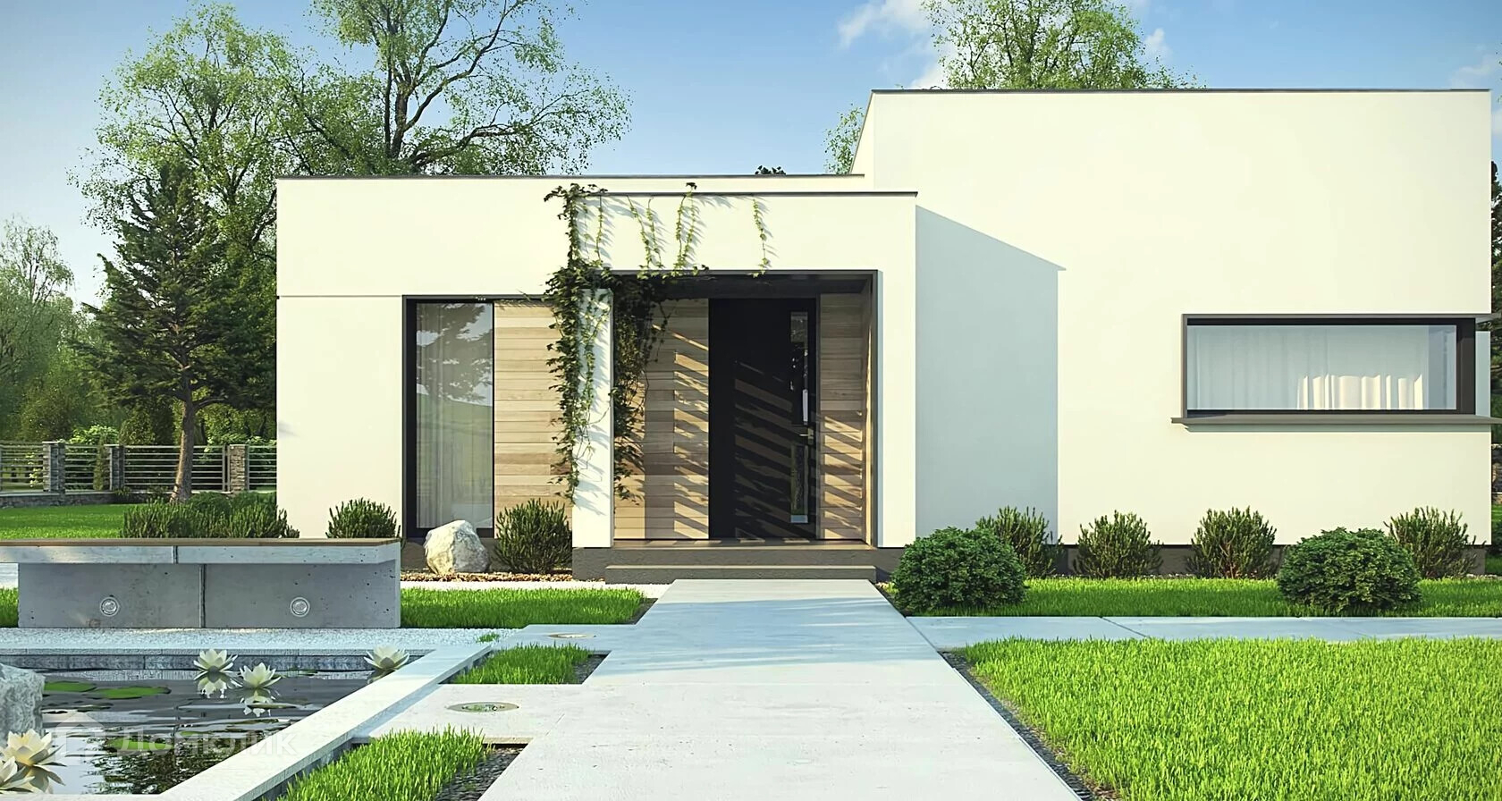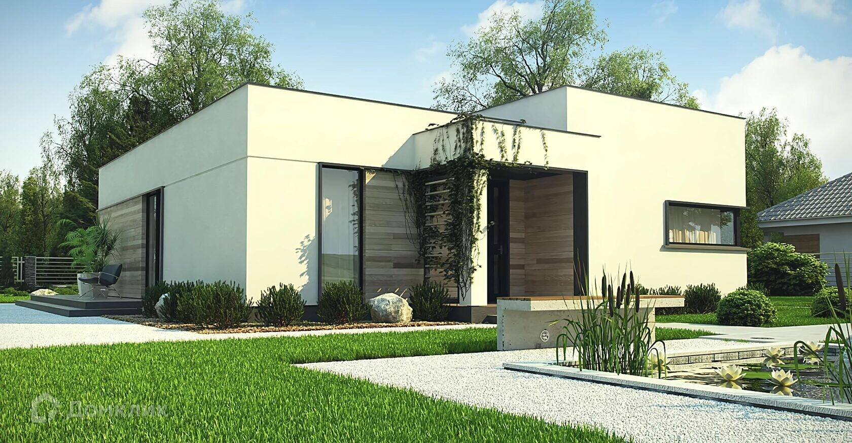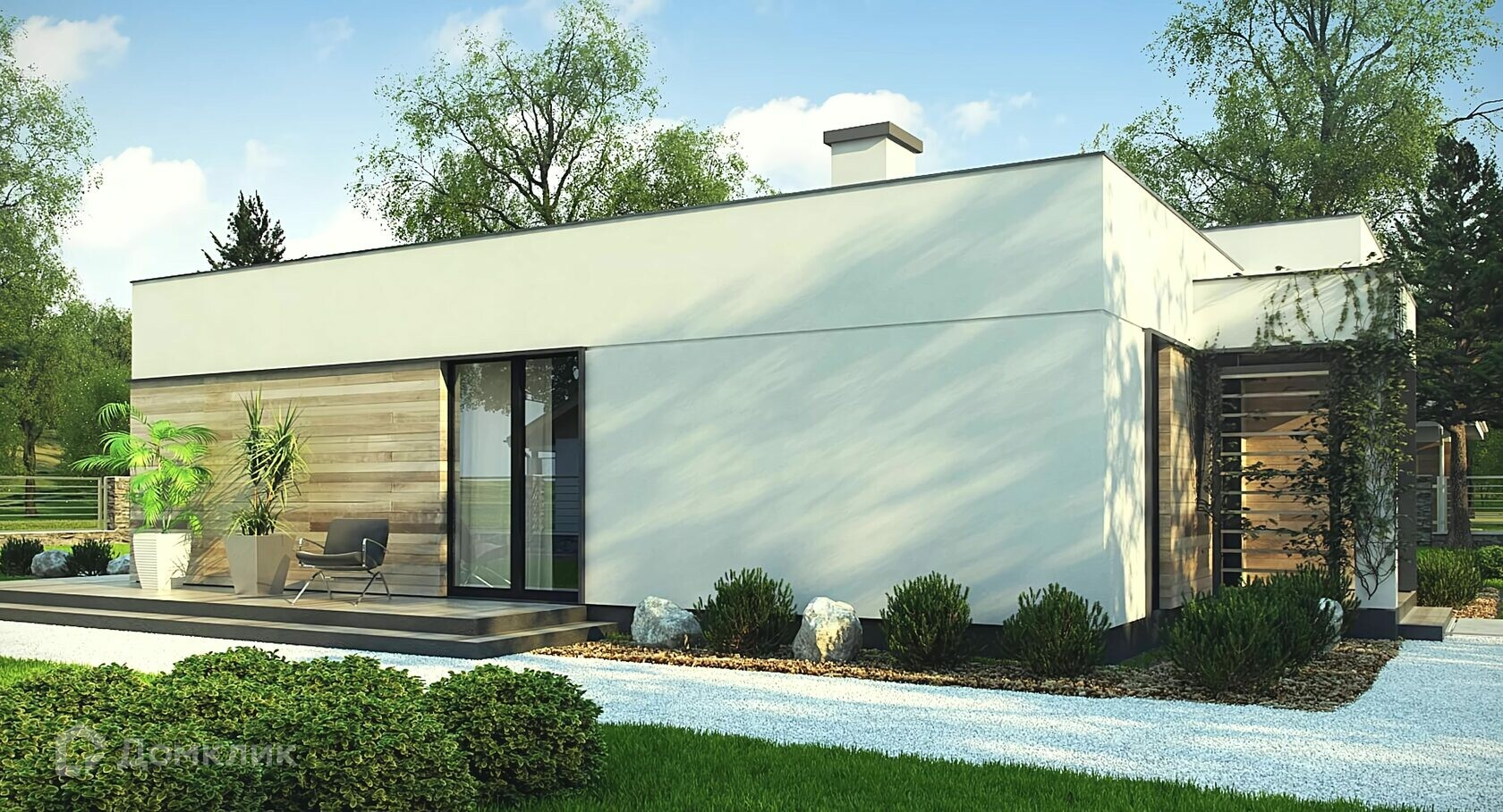 Одноэтажный дом с панорамными окнами и плоской кровлей. Проект предназначен для ценителей современных домов с оригинальным функциональным интерьером.