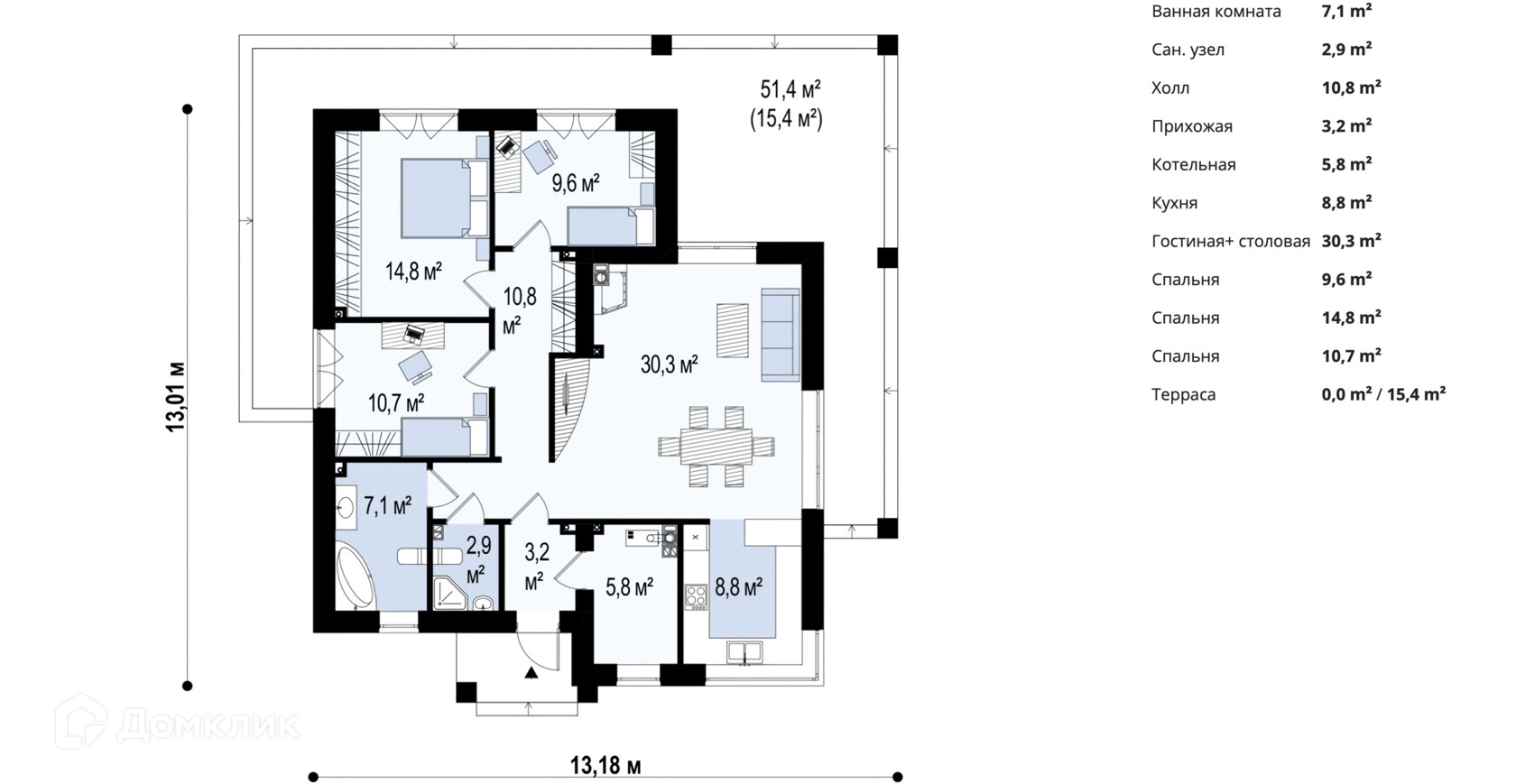 Дом имеет 3 спальни, 2 санузла и просторную кухню-гостиную с панорамным остеклением и выходом на террасу.