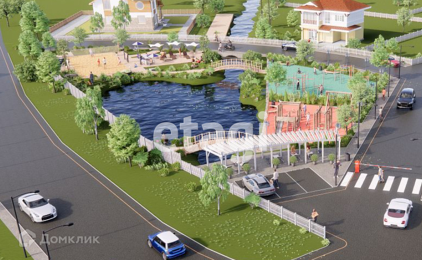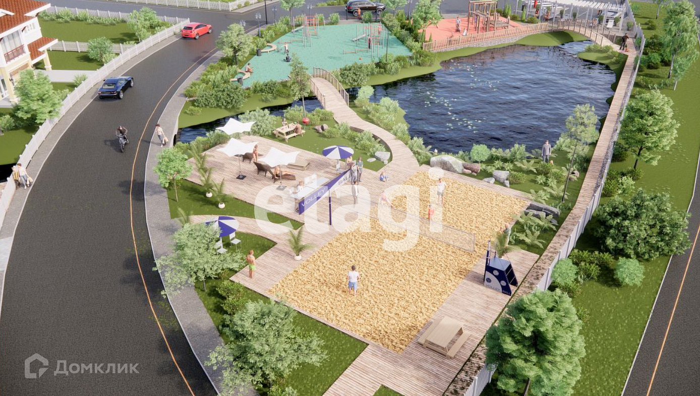 При въезде на территории поселка расположилось искусственное озеро, песчаный пляж.