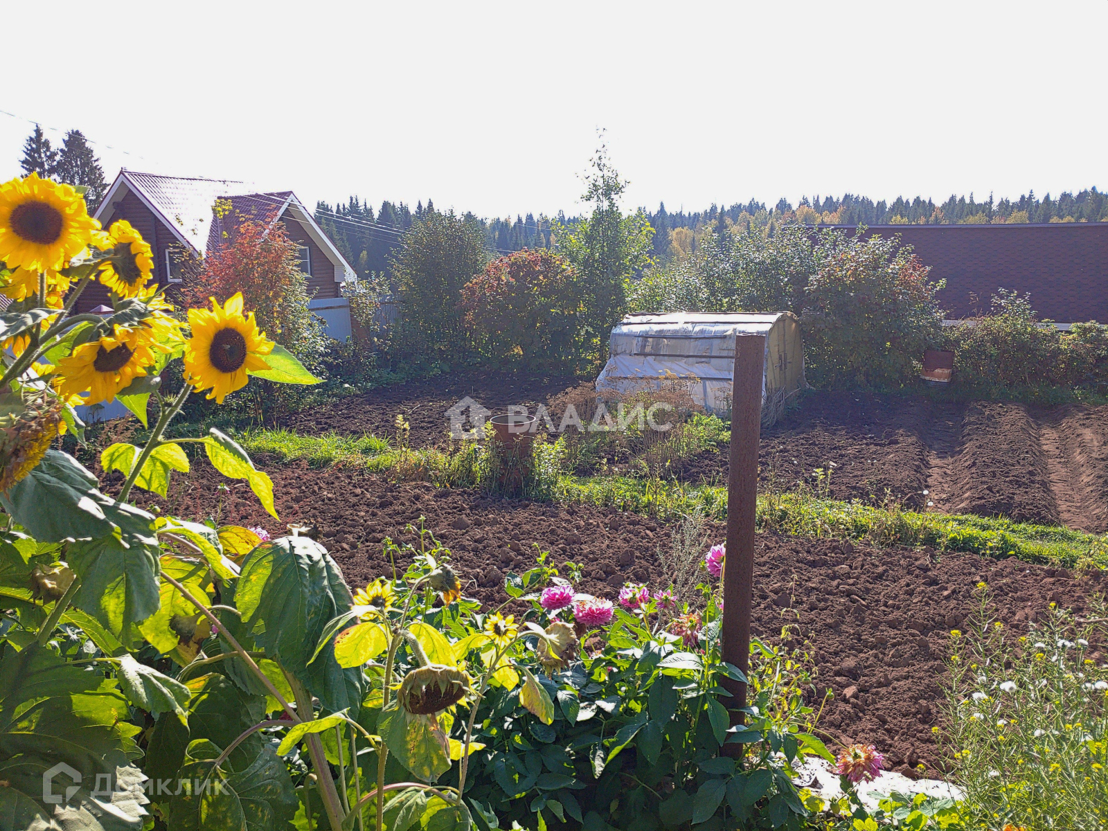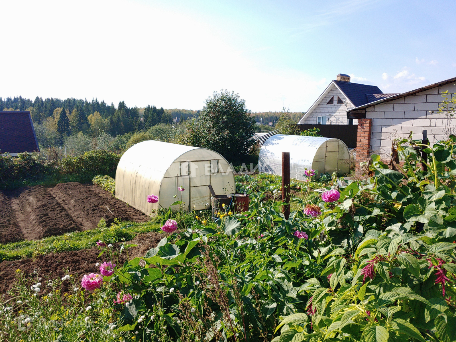 На огороде 3 теплицы, посадки и грядки.