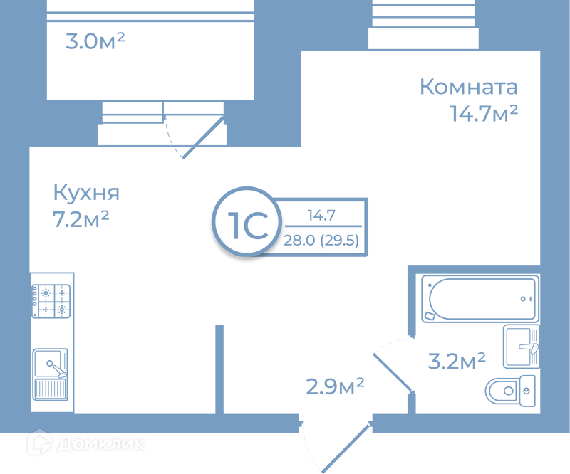 Общая площадь 29.5 м2