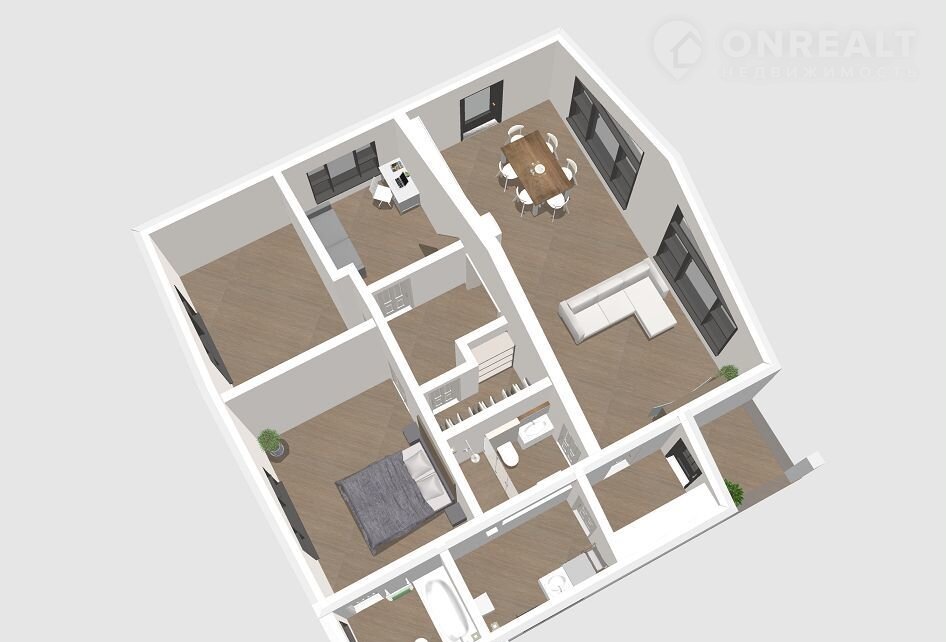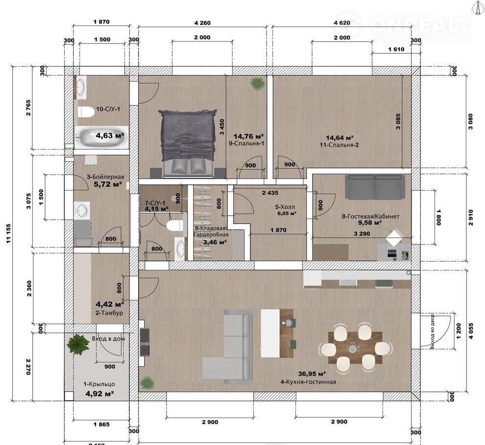 - 3 спальни включая мастер рум, кухня-гостинная, 2 санузла, гардеробная, бойлерная, холл, прихожая.