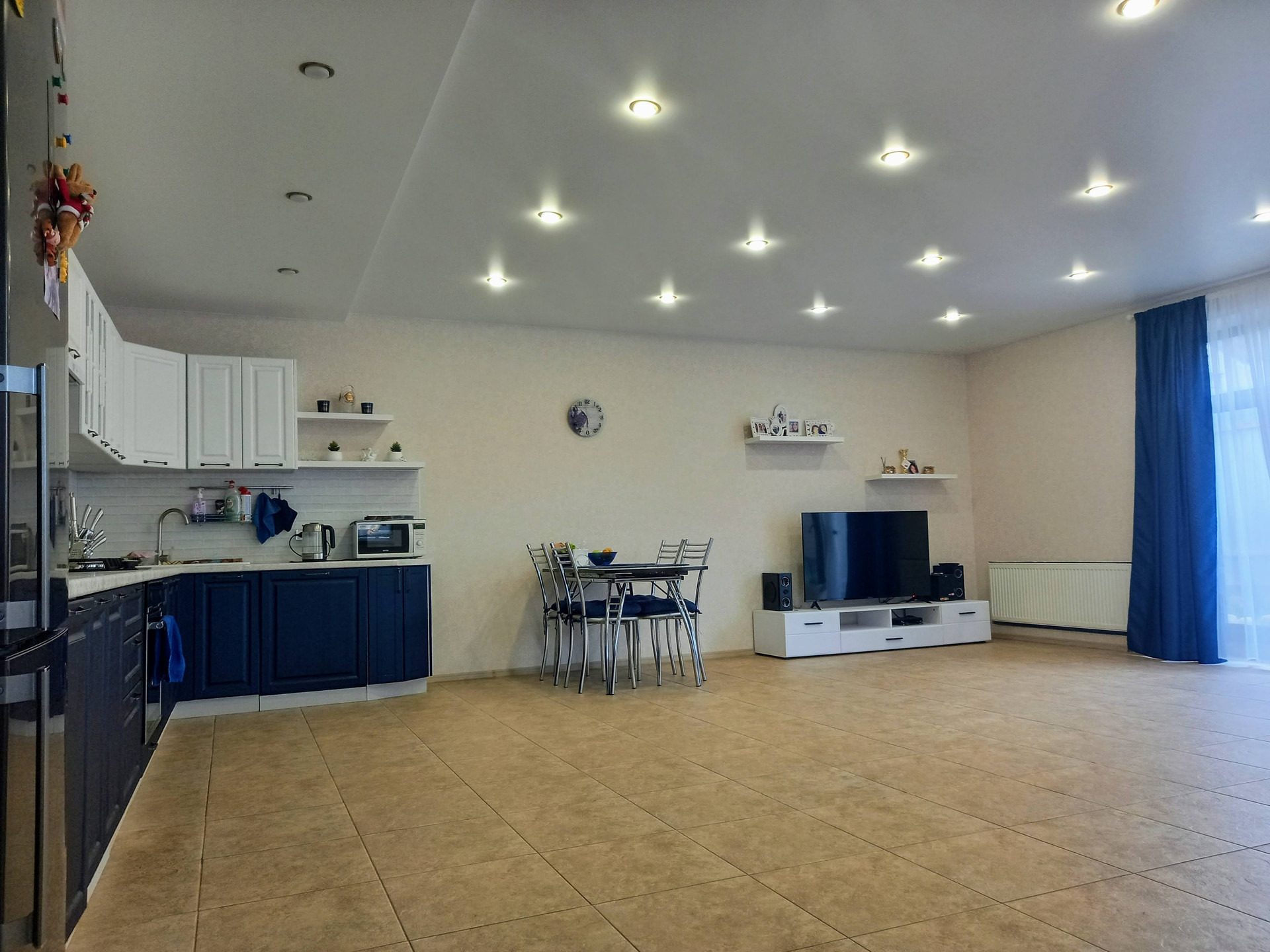 В наше предложение не включена мягкая и корпусная мебель, холодильник и телевизор. Остаются кухонный гарнитур с варочной панелью и духовым шкафом, вытяжка, а также вся сантехника в санузлах.
