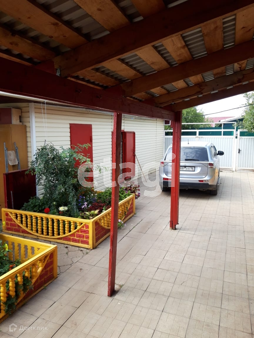 Двор выложен плиткой, установлен навес к дому.