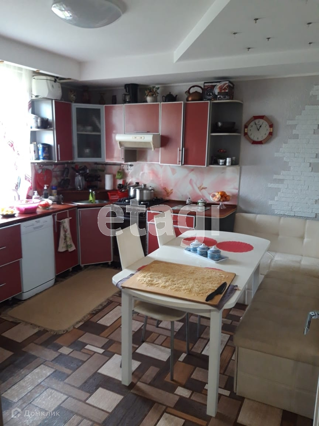 В доме очень просторная кухня с кухонным гарнитуром, установлены натяжные потолки, санузел внутри.