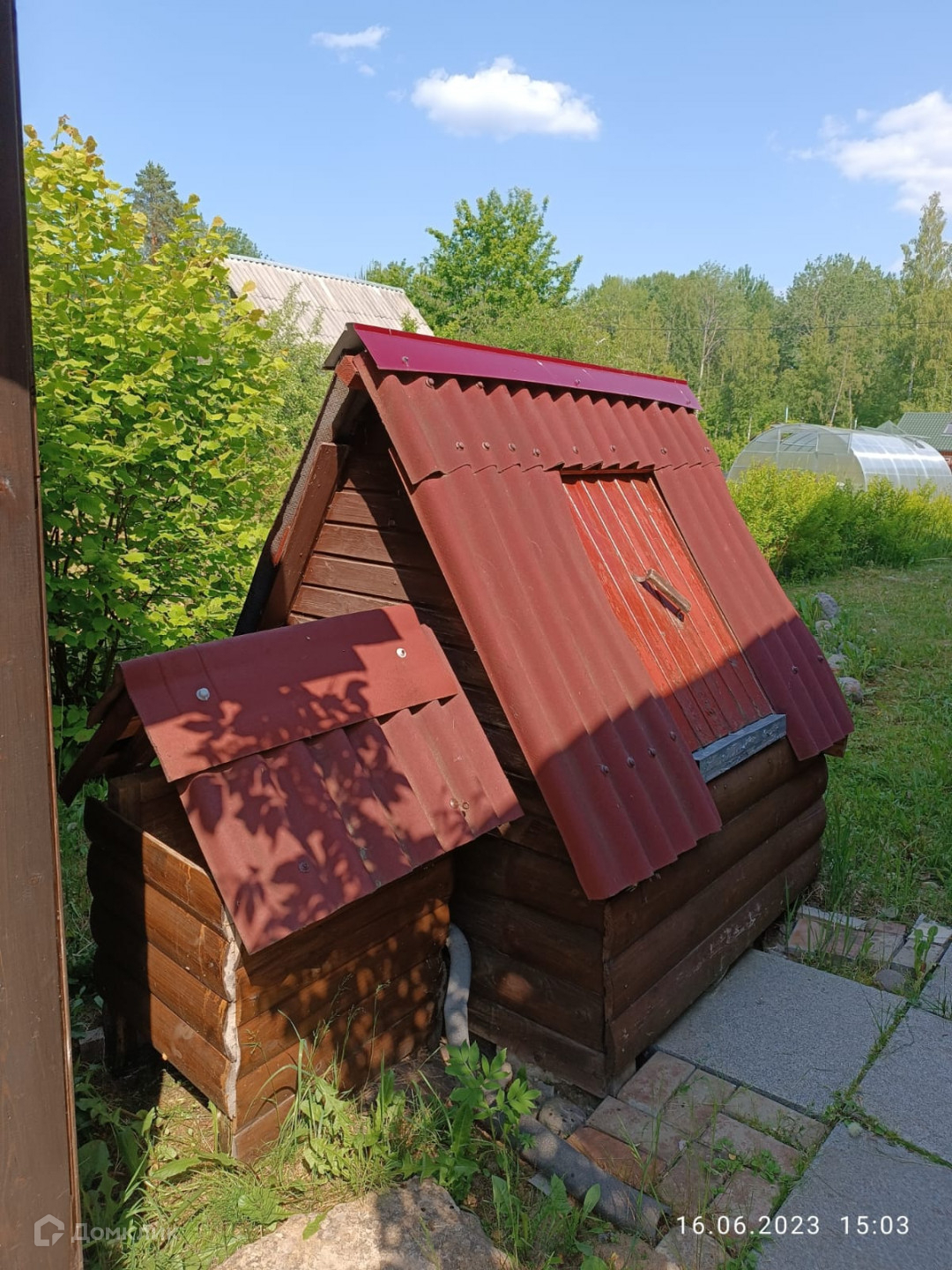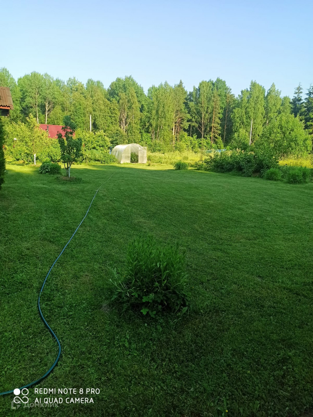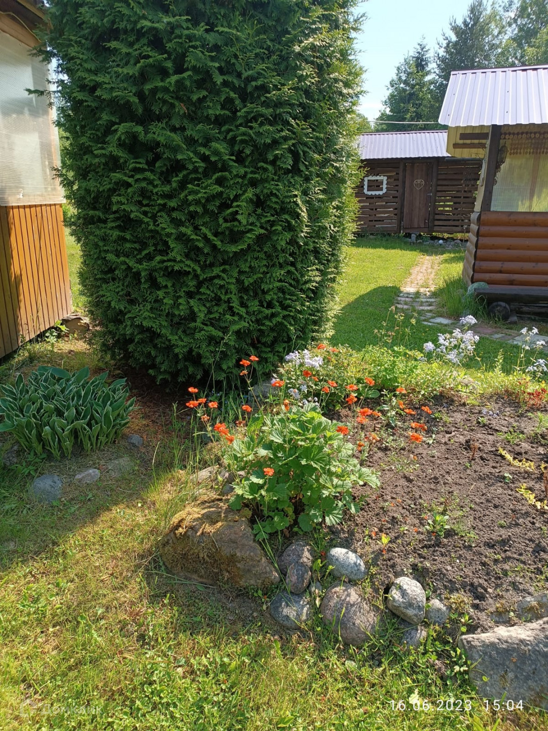 Ровный участок, ухоженный, плодовые деревья (груши, яблони), кусты черной, красной, белой смородины, крыжовник..., хвойные растения, цветник. Соседи с двух сторон, с третьей стороны лес.