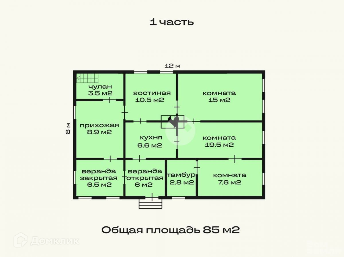 1 этаж - открытая и закрытая веранды, прихожая, две гостинные, кухня, 3 комнаты, чулан и тамбур.