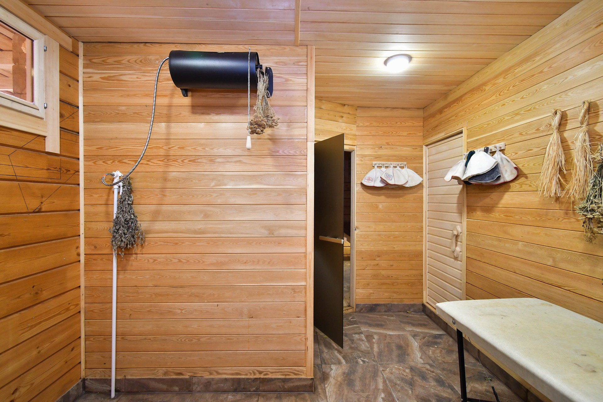 Выход с бани отдельно, в жилую часть отдельный вход через второй этаж.