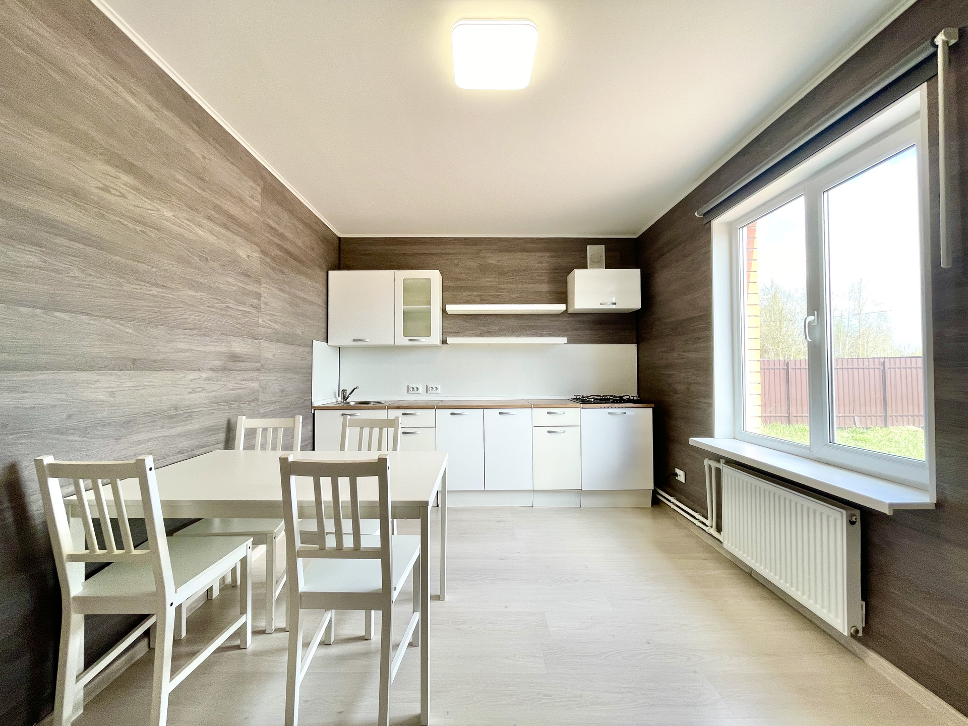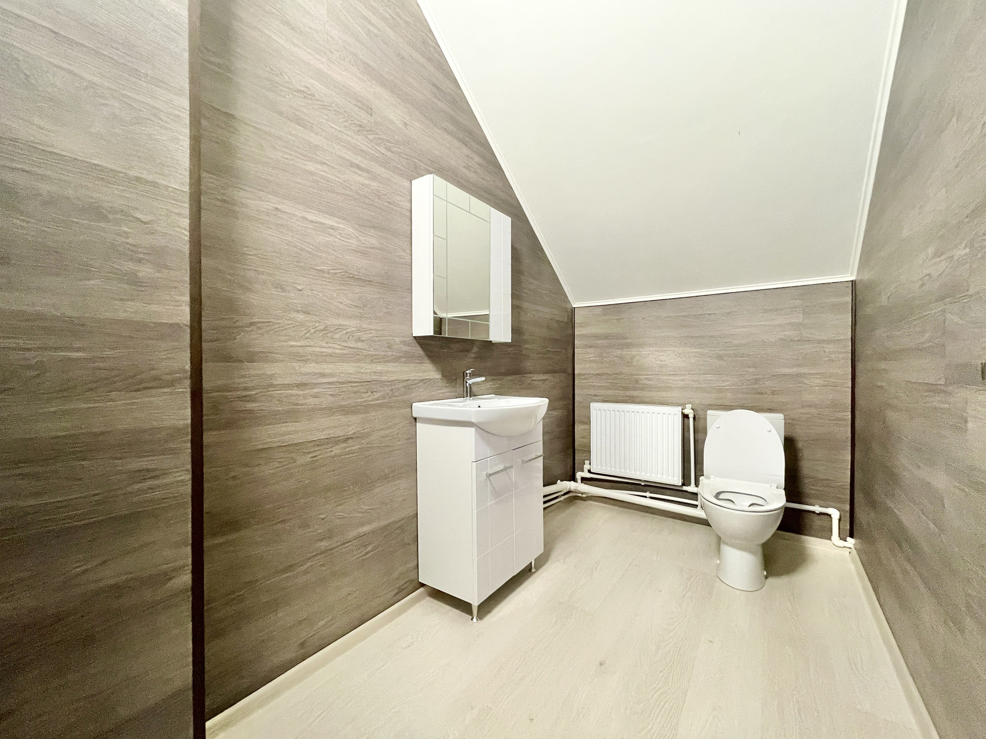 На первом этаже: просторная кухня, гостиная, спальная комната, санузел, котельная