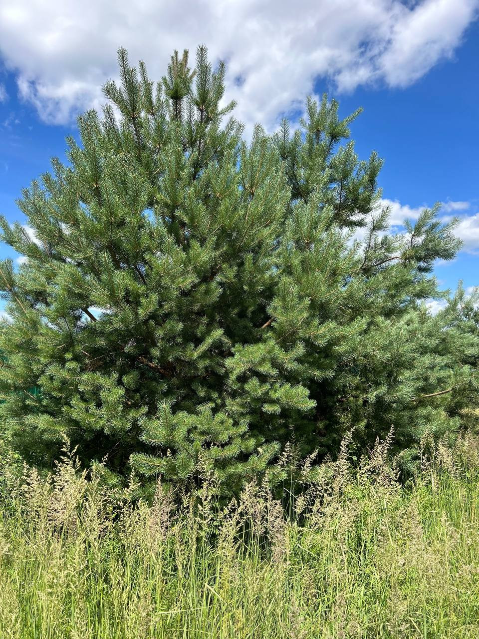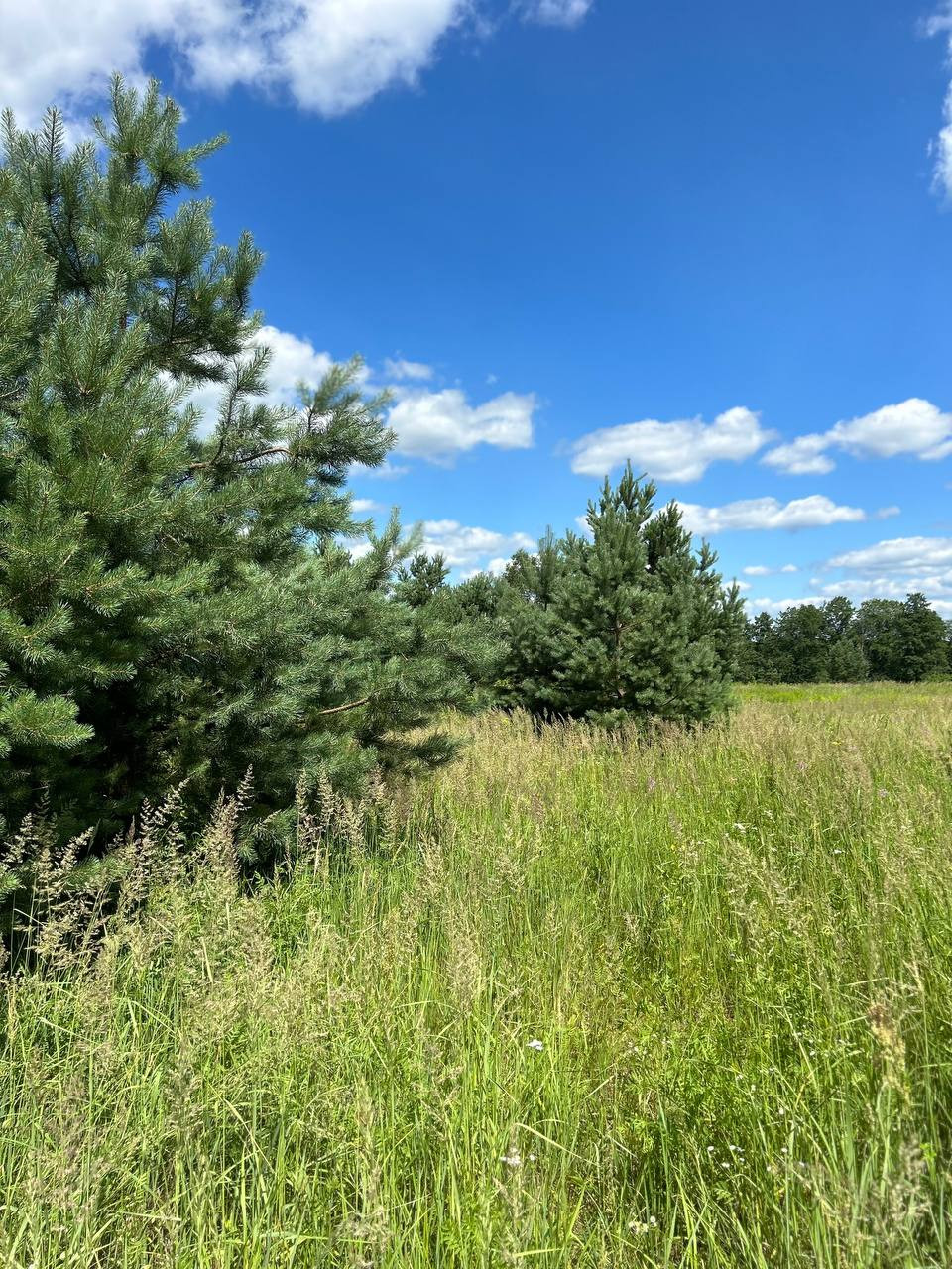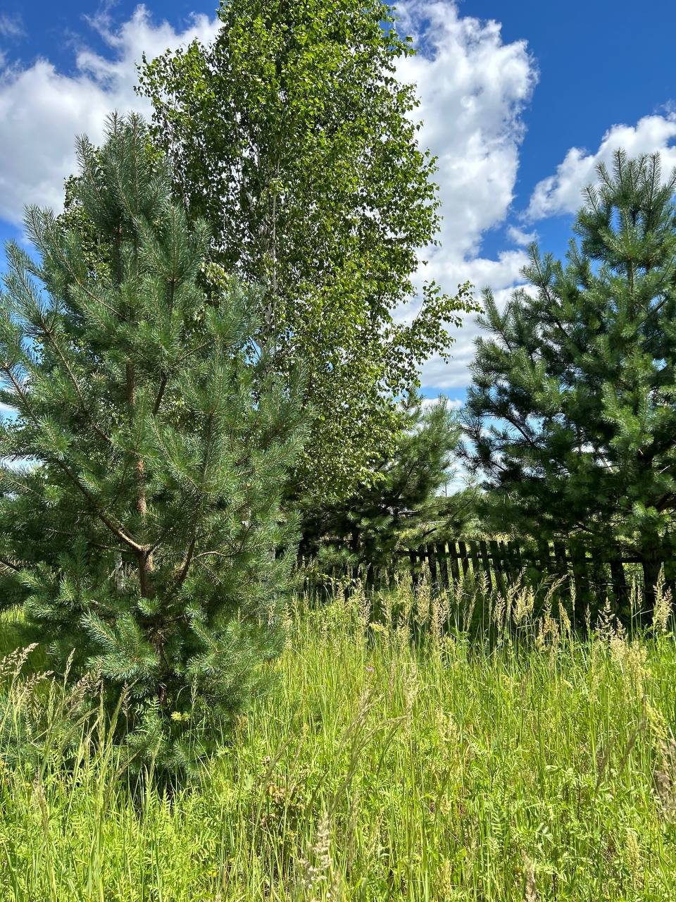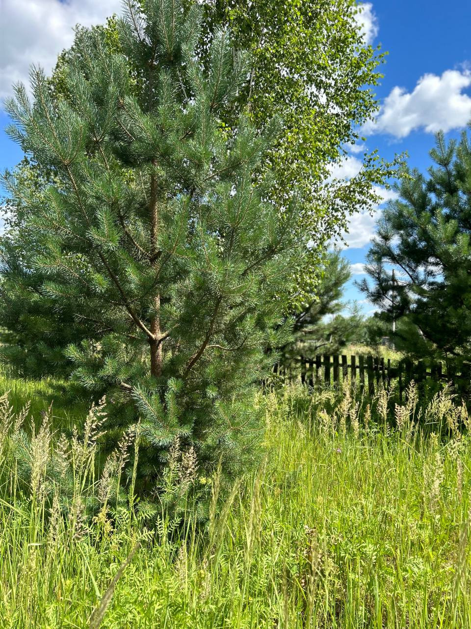 • на участке несколько сосен и берёза