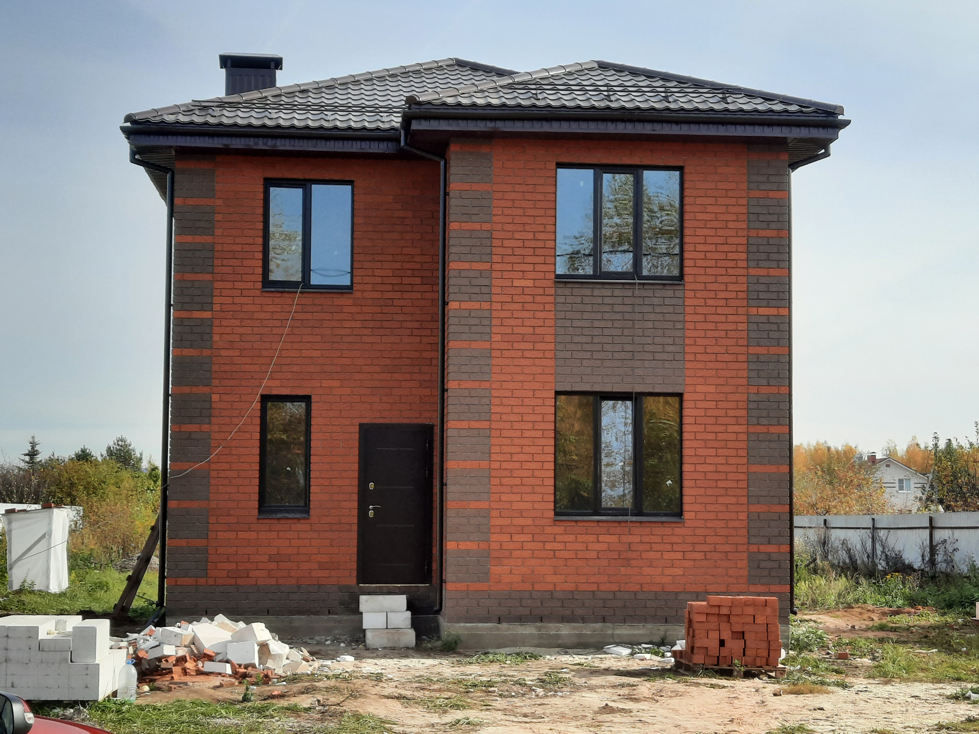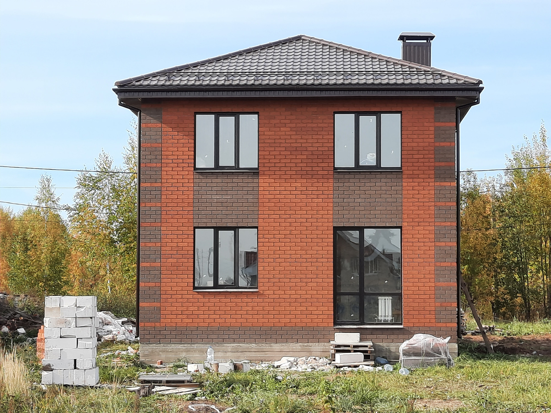 Дом продается в предчистовой отделке: стены, заштукатуренные под обои, на полу ровная стяжка, на окнах откосы и подоконники, натяжные потолки, разводка электричества, теплые полы по всему первому этажу от двухконтурного котла, радиаторы по 1ому и 2ому этажам.