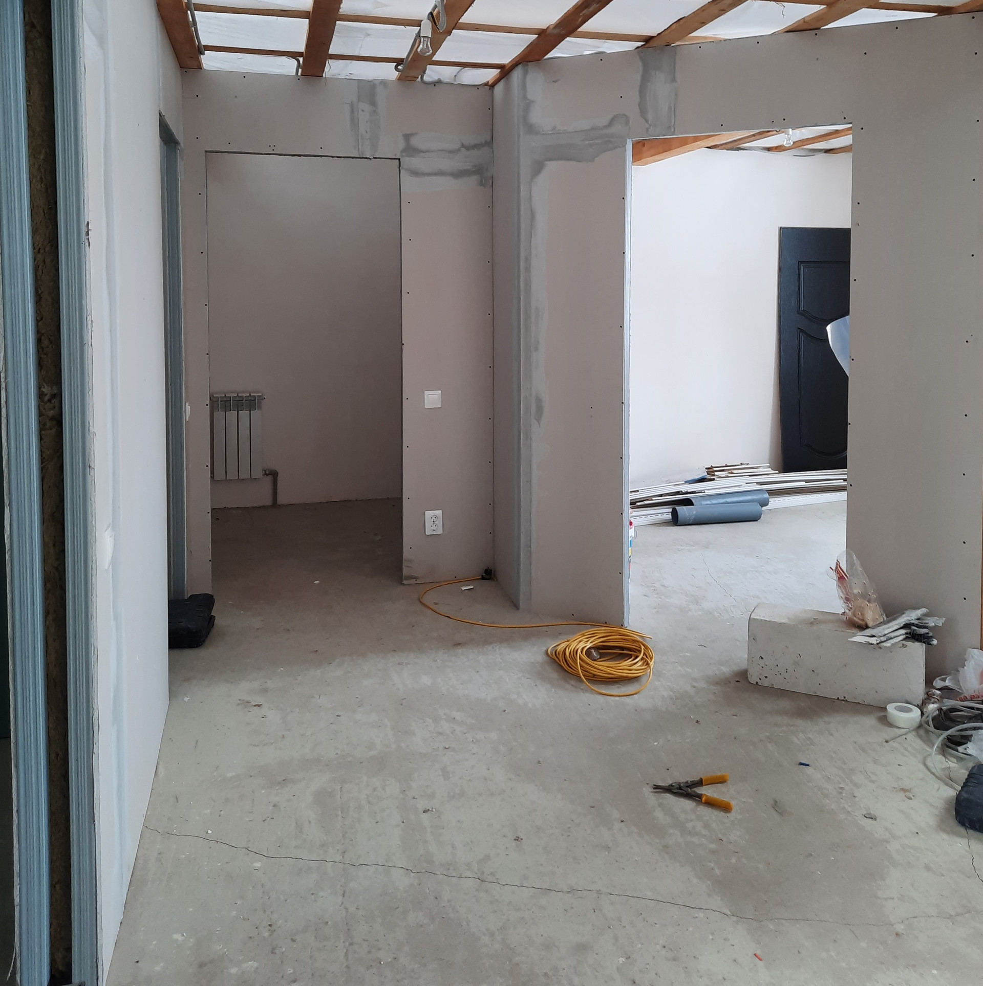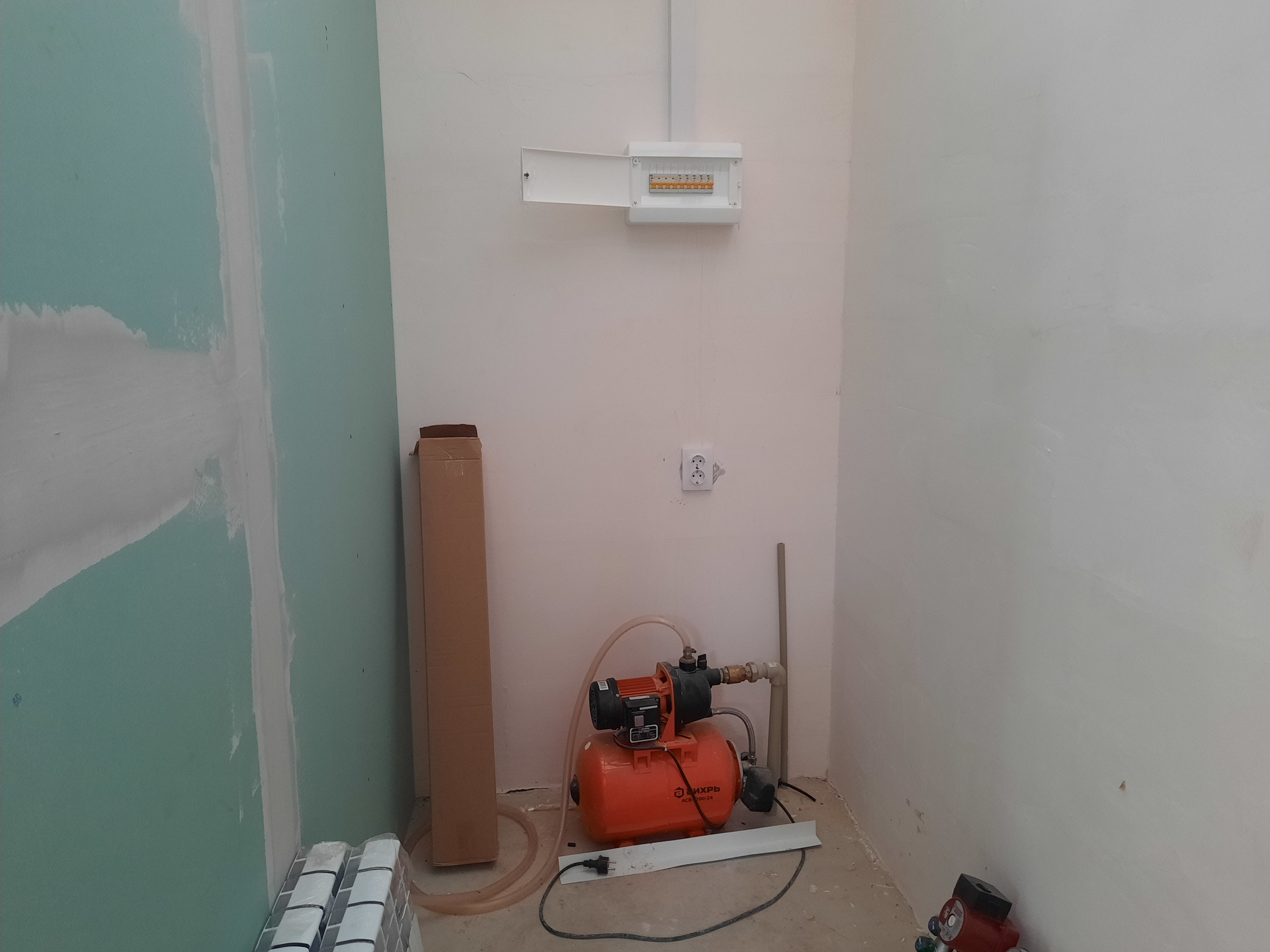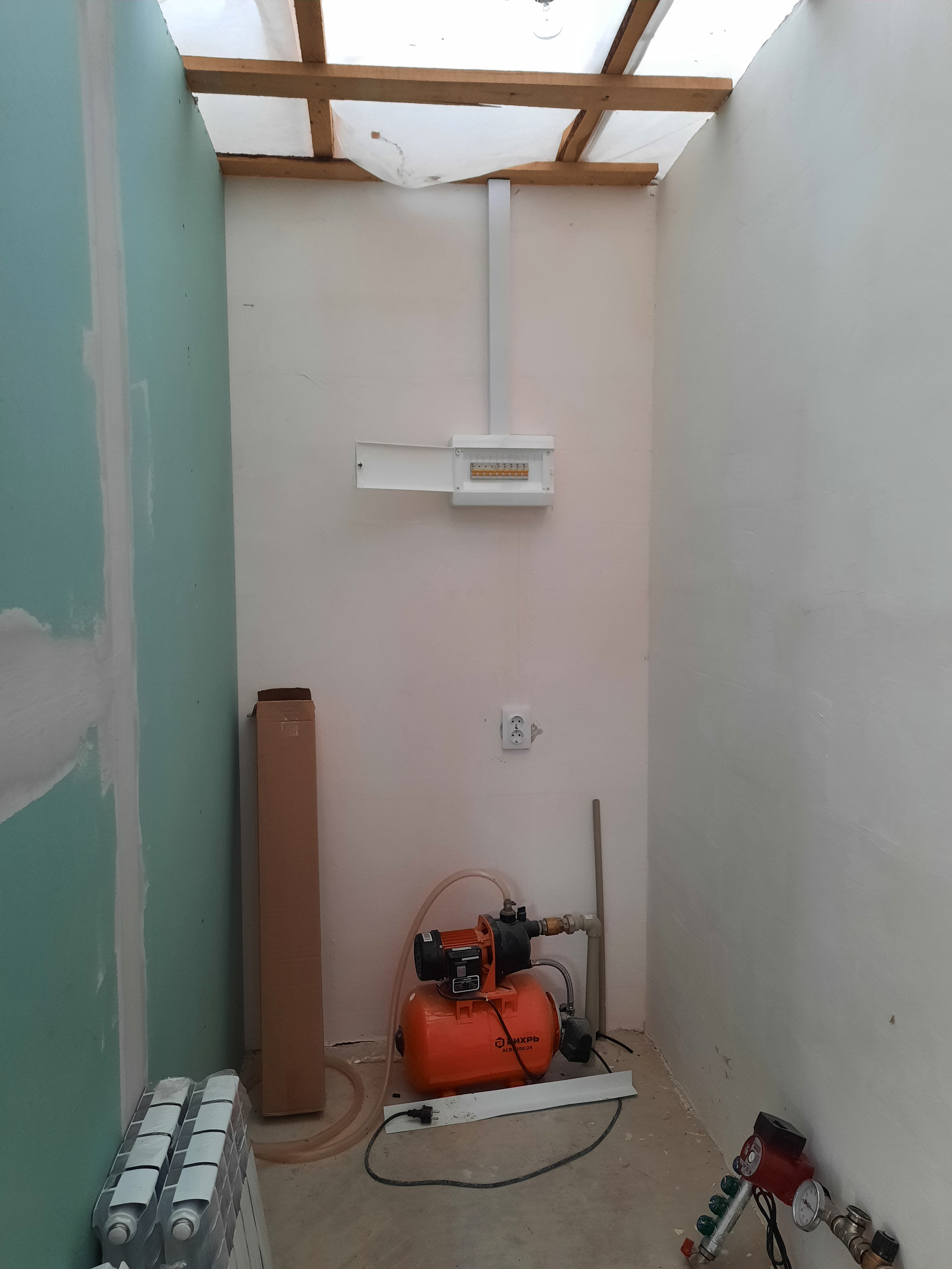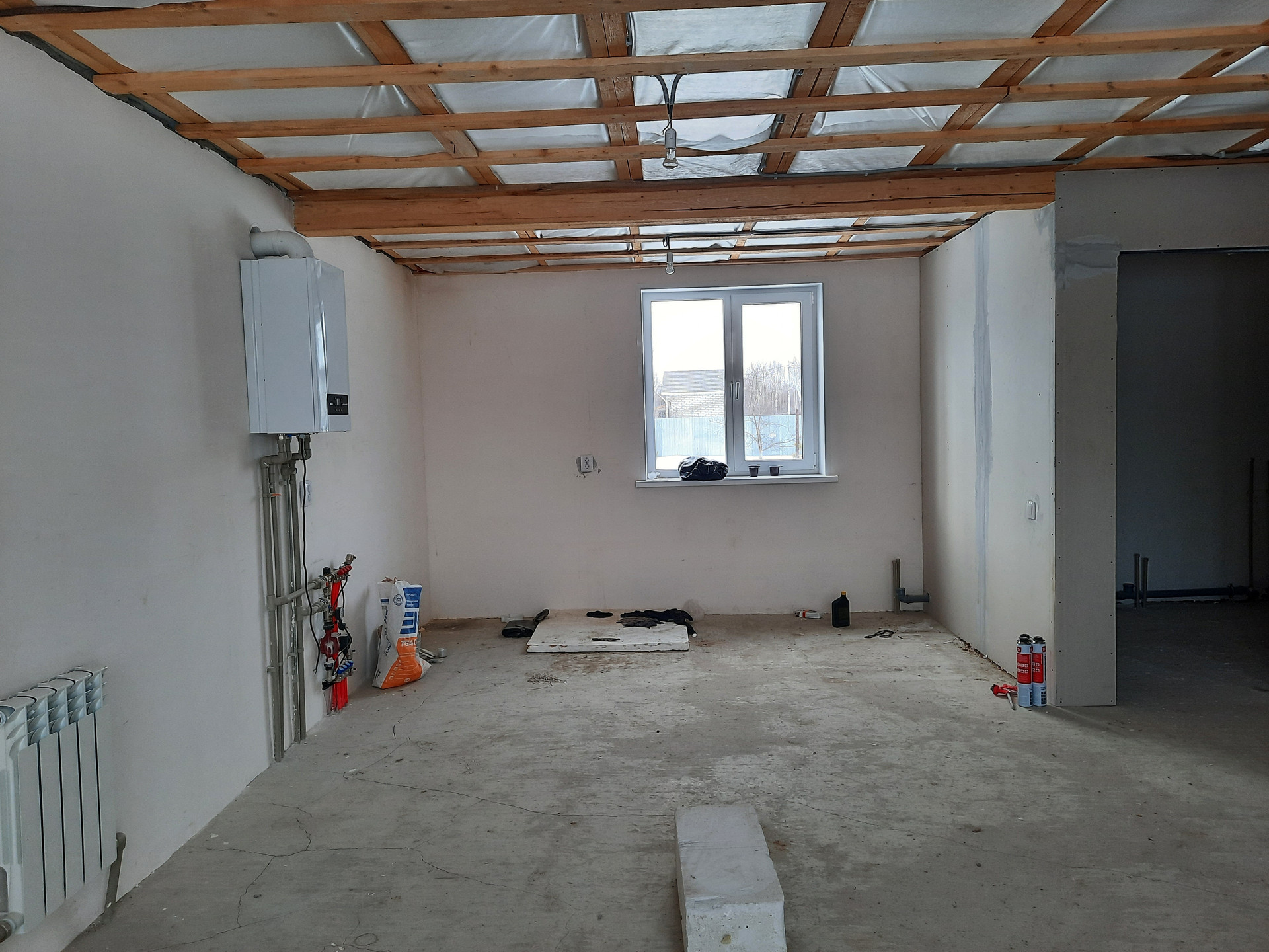 Отделка 1-ого этажа: смонтировано электричество, отопление, теплый пол по 1му этажу, выполнены межкомнатные перегородки. В наличии двухконтурный котел, насосная станция.