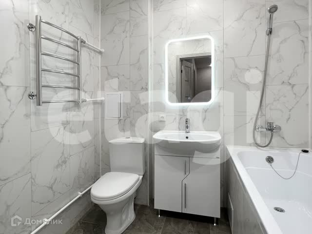 Санузел с акриловой ванной, раковина с тумбой, розетка для фена, зеркало с подсветкой, удобный полотенцесушитель-лесенка, подключение для стиральной машины, розетка для стиральной машины, керамогранит.
