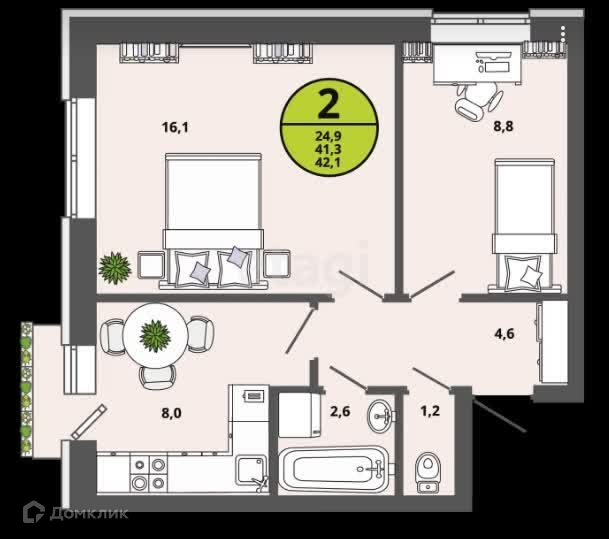Общая площадь 41.2 м2