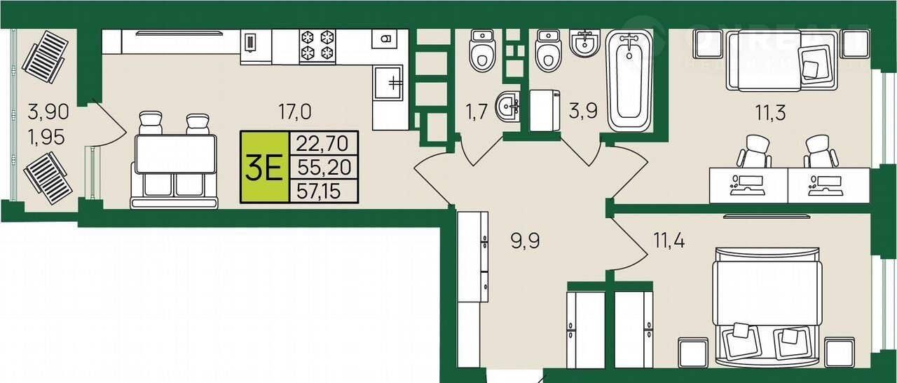 Общая площадь 55.2 м2