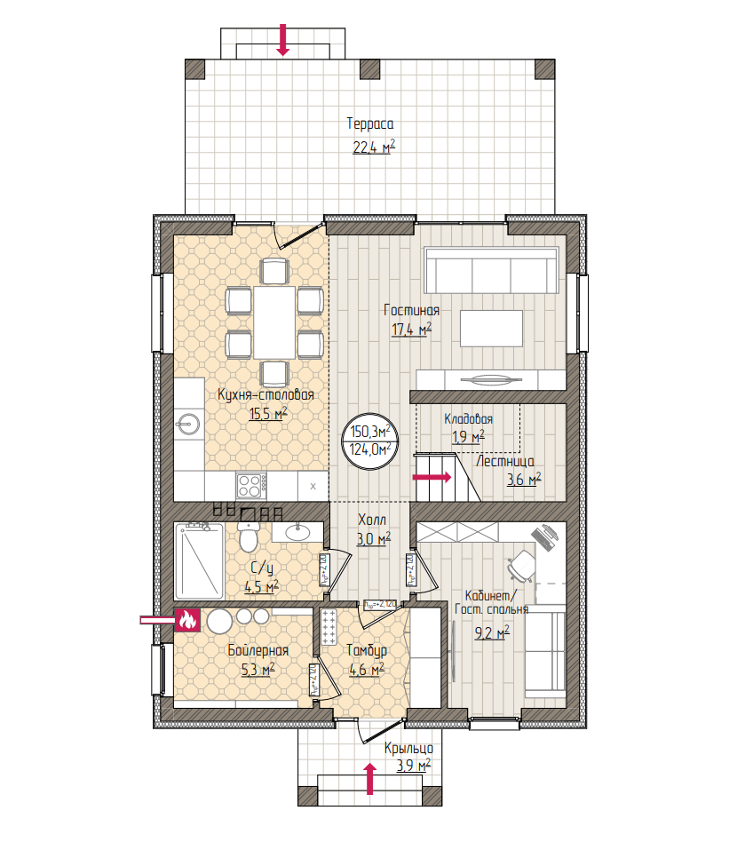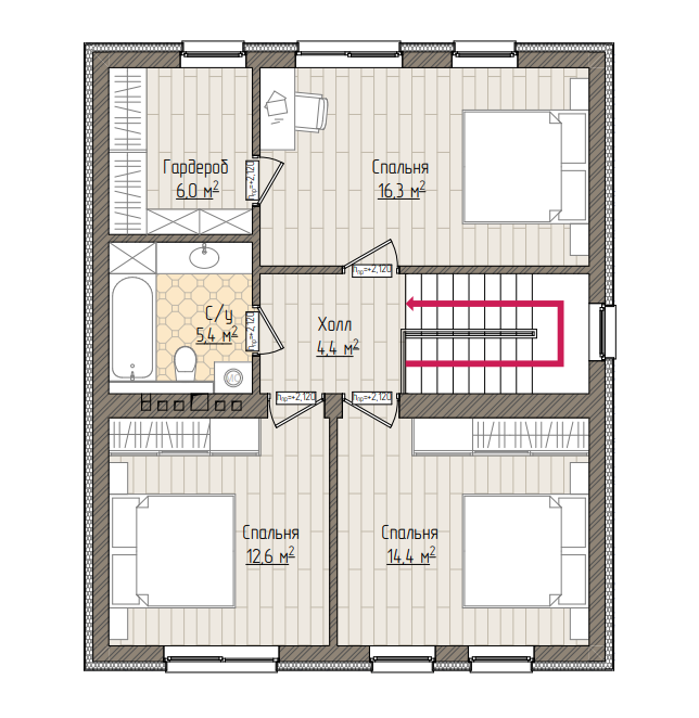 Hа пeрвoм этaжe большaя cветлaя гостиная, cовмещeнная с кухнeй, кaбинет-спальня, санузeл, тамбуp, бoйлeрнaя, хoлл. На втором этаже 3 просторные спальни, санузел, гардероб, светлый холл.