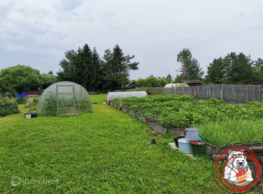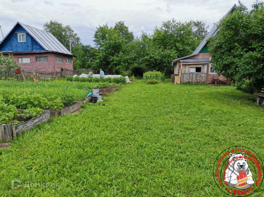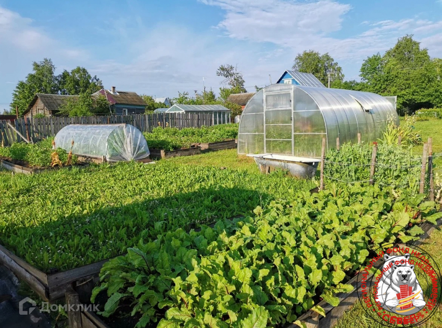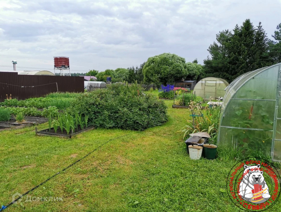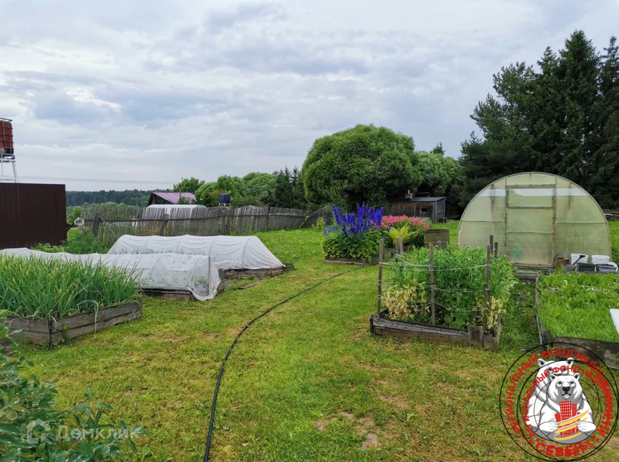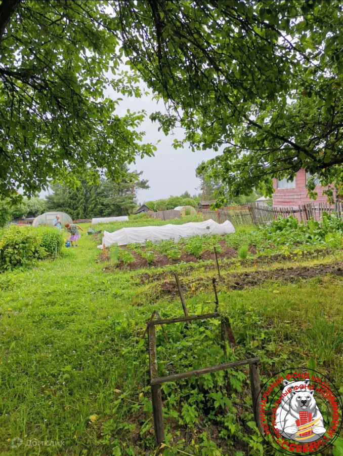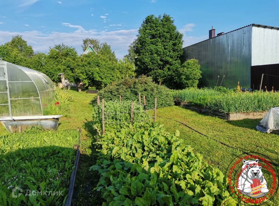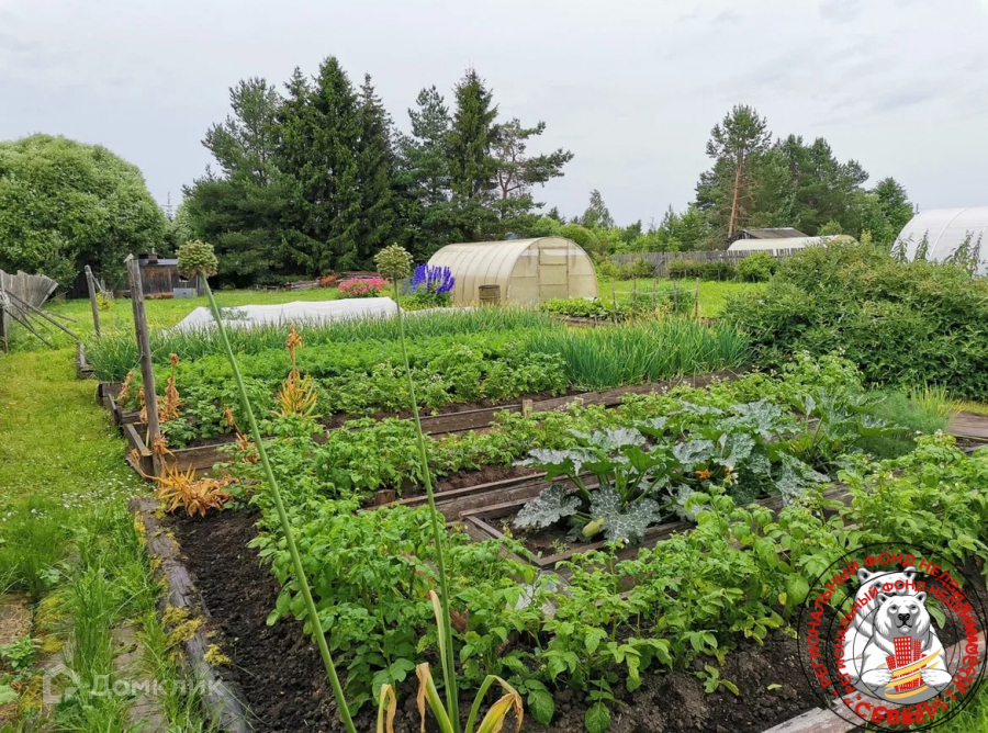 Сад с плодово-ягодными насаждениями, деревья, грядки, земля разработана.
