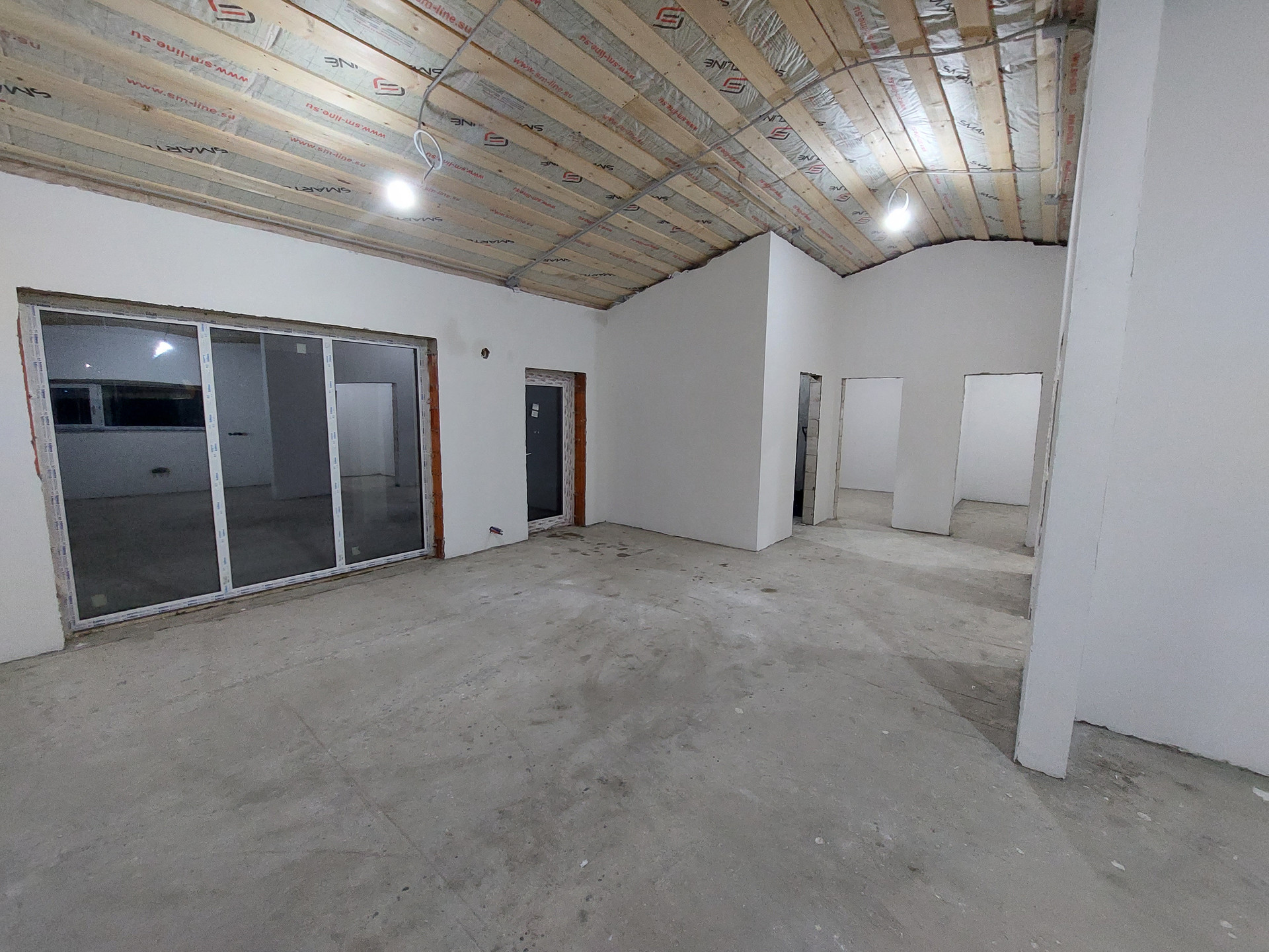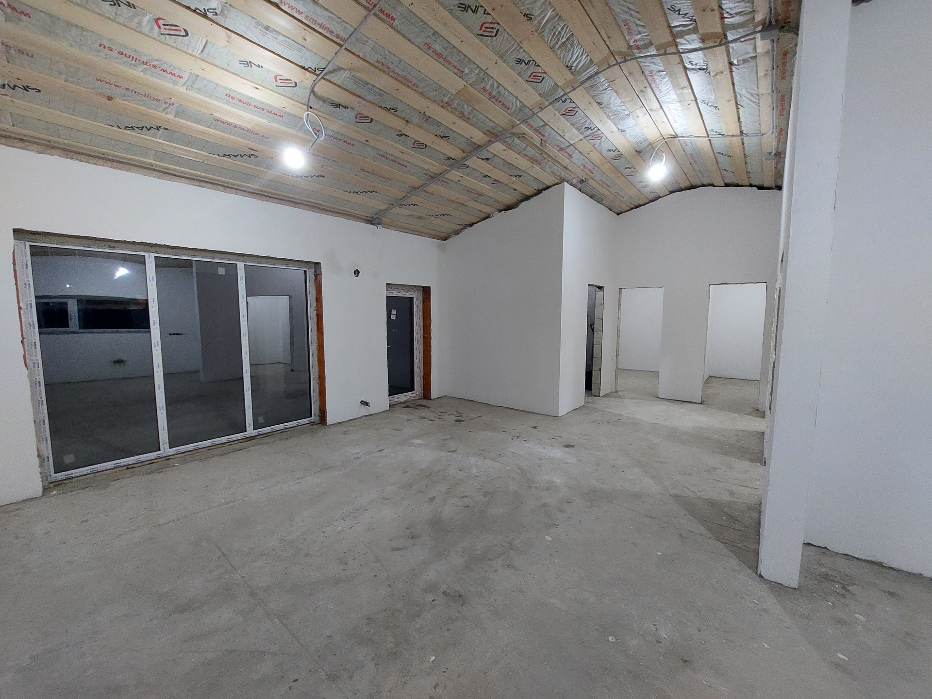 Дом одноэтажный с ПАНОРАМНЫМ остеклением, высокими потолками (от 3 до 4 метров), верандой и участком 10 сот.
