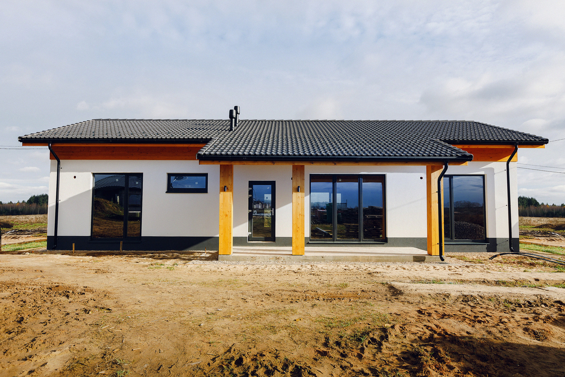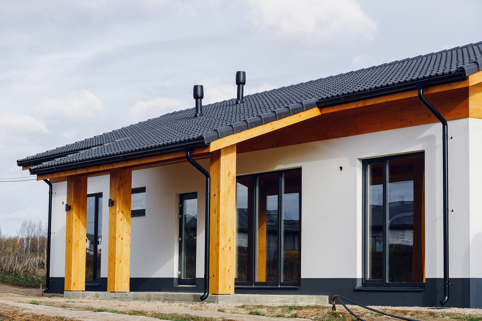 Одноэтажный дом 126 м2 с верандой, панорамным остеклением, высокими потолками (3-4,5 метра) из премиальных, исключительно природных материалов.