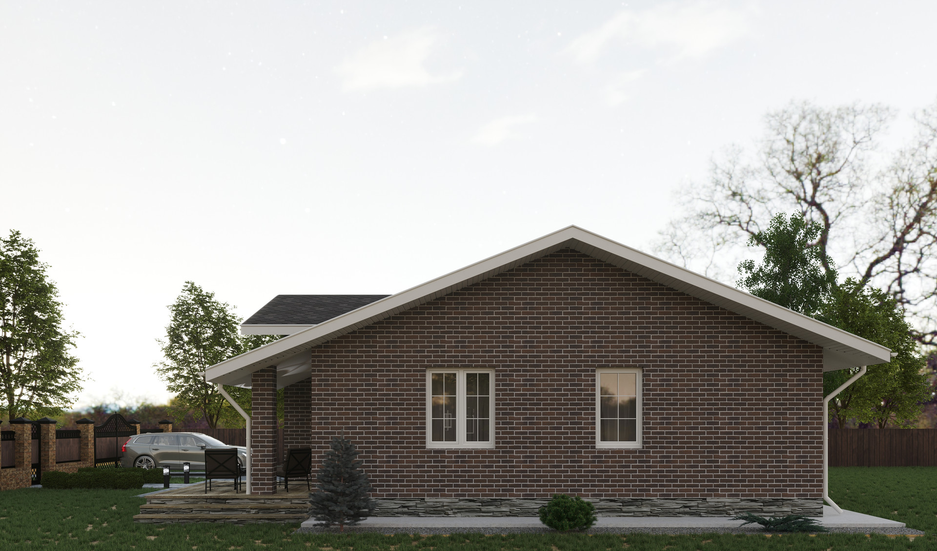 Также к фасаду дома примыкает терраса с лицевой стороны дома.