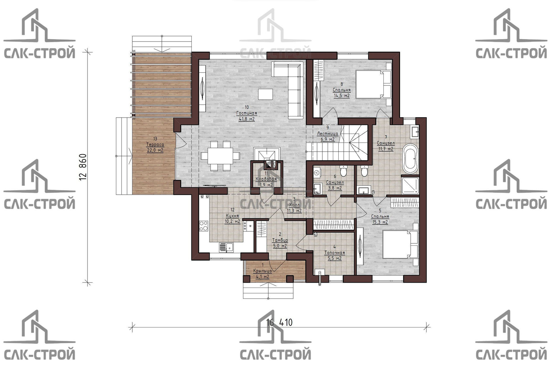 Каменный дом общей площадью 283,8 квадратных метров - это идеальный вариант для тех, кто хочет создать уютное и комфортное жилье. Дома располагается просторная кухня, огромная гостиная, кладовая, 2 спальни, 2 санузла и большая терасса. На втором этаже находятся 3 спальни, огромная гардеробная и санузел.