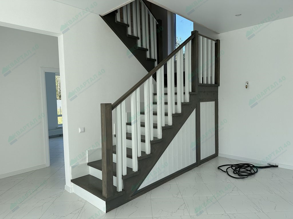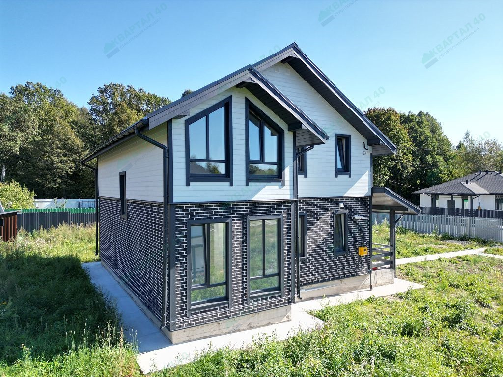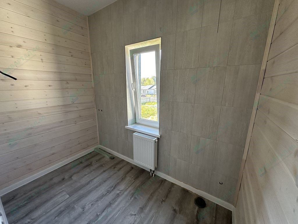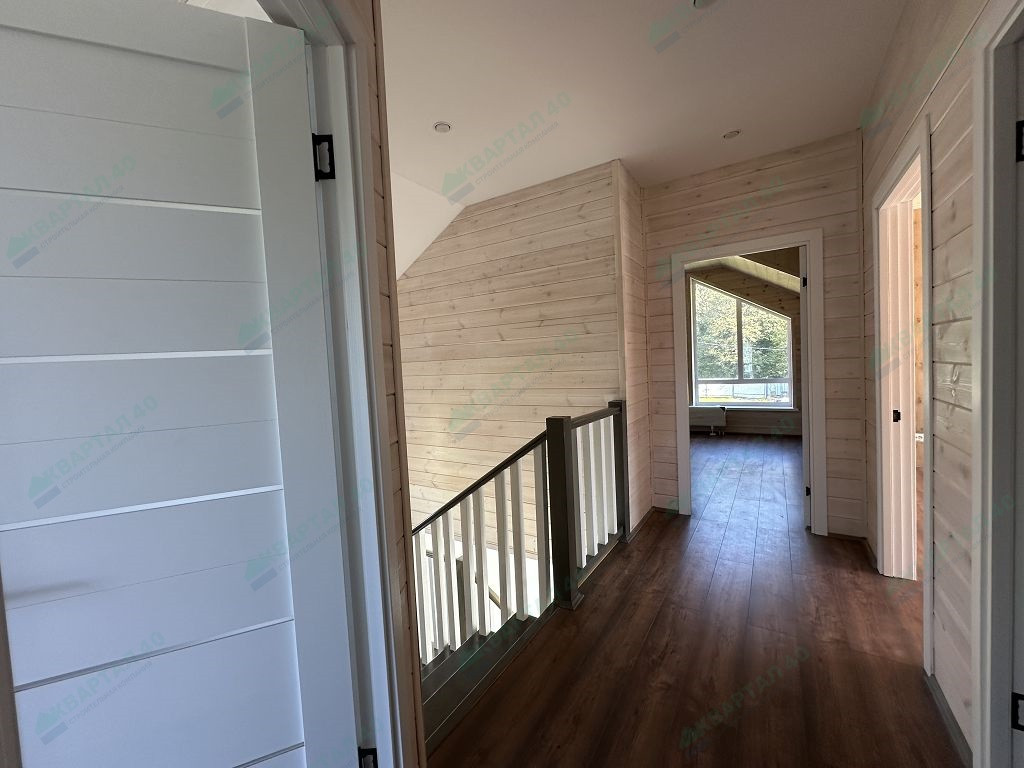 Материал стен – газоблок с утеплением стен, отделка наружная – фасадная плитка Hauberk / имитация бруса, внутренняя: 1 этаж покрашенные обои, 2 этаж – покрашенная имитация бруса;