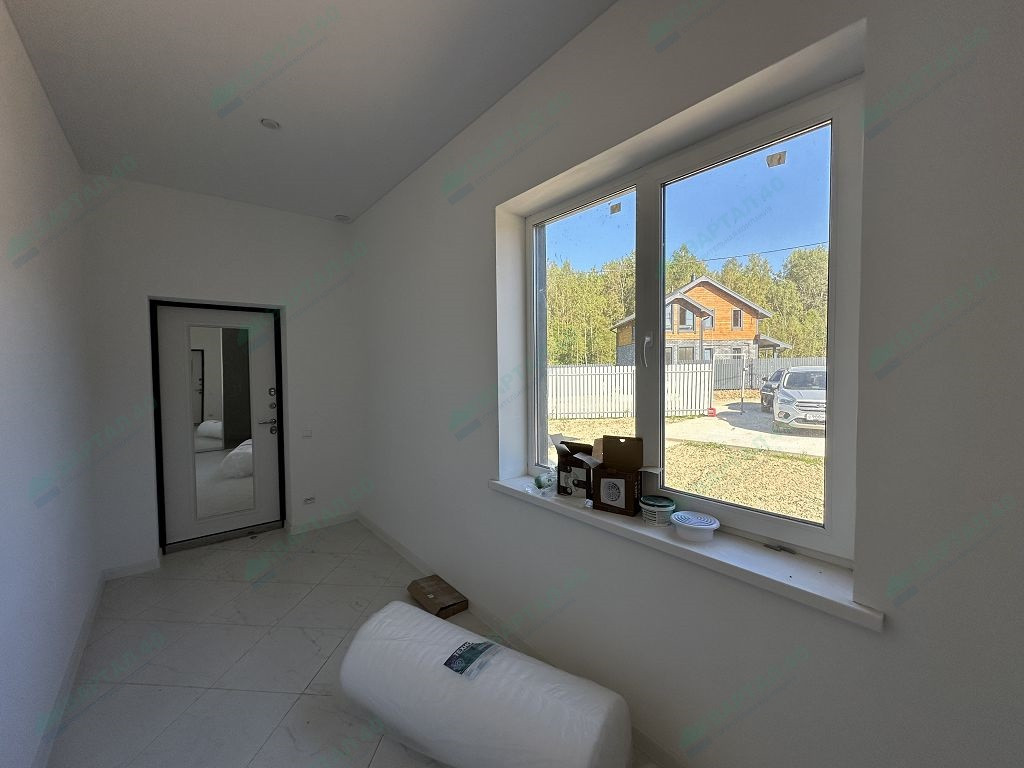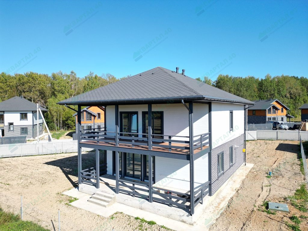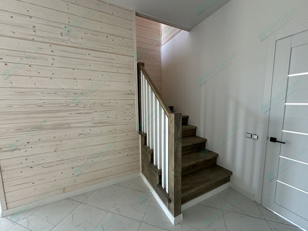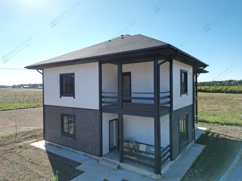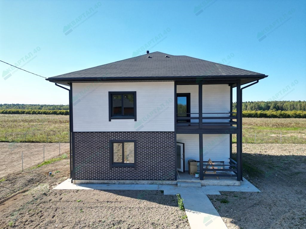 Материал стен – газоблоки с утеплением, отделка наружная: 1 этаж - фасадная плитка Hauberk, 2 этаж - имитация бруса, внутренняя – 1 этаж стены обои, 2 этаж – покрашенная имитация бруса;