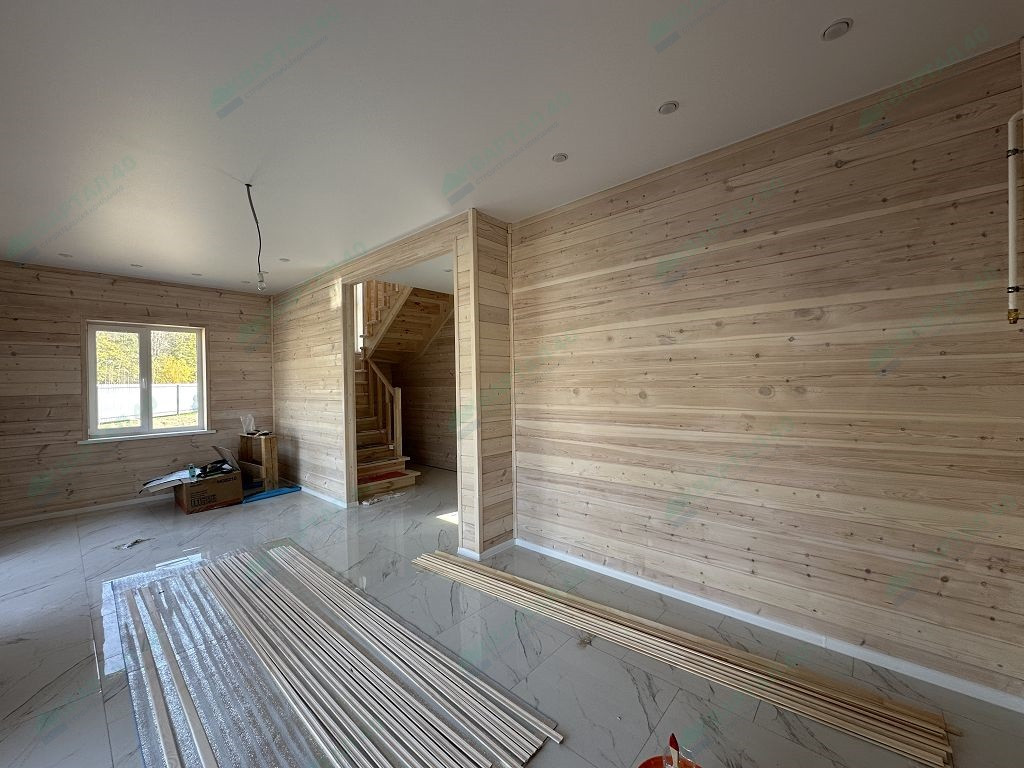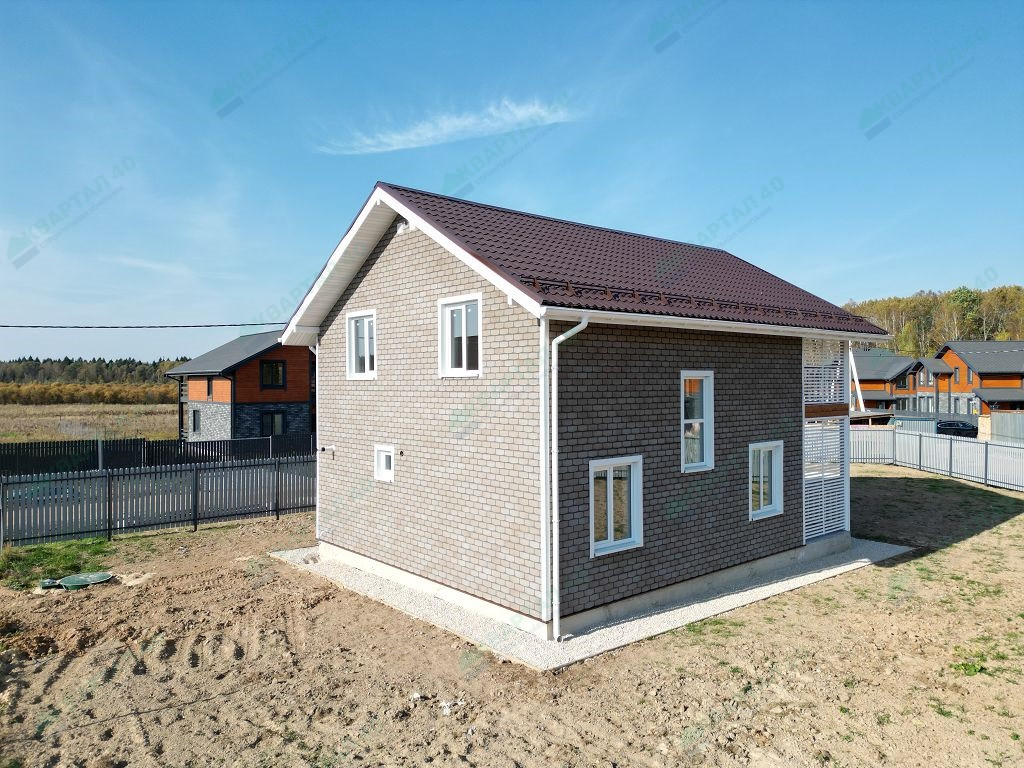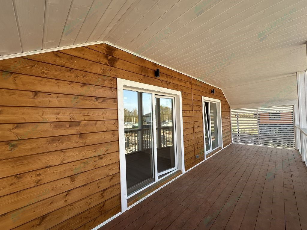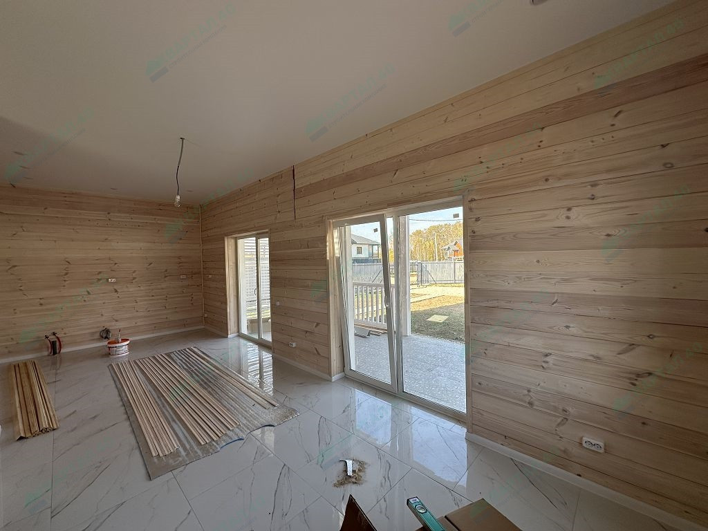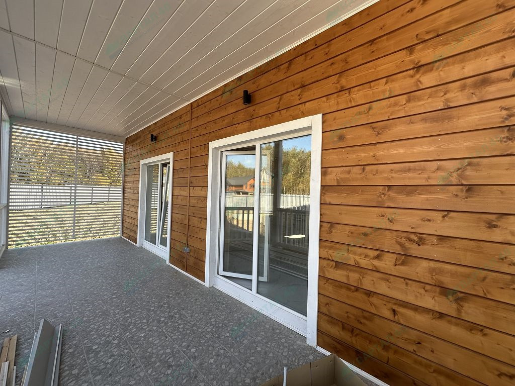 Материал стен – газоблоки с утеплением, отделка наружная: фасадная плитка Hauberk / имитация бруса, внутренняя – имитация бруса / плитка;