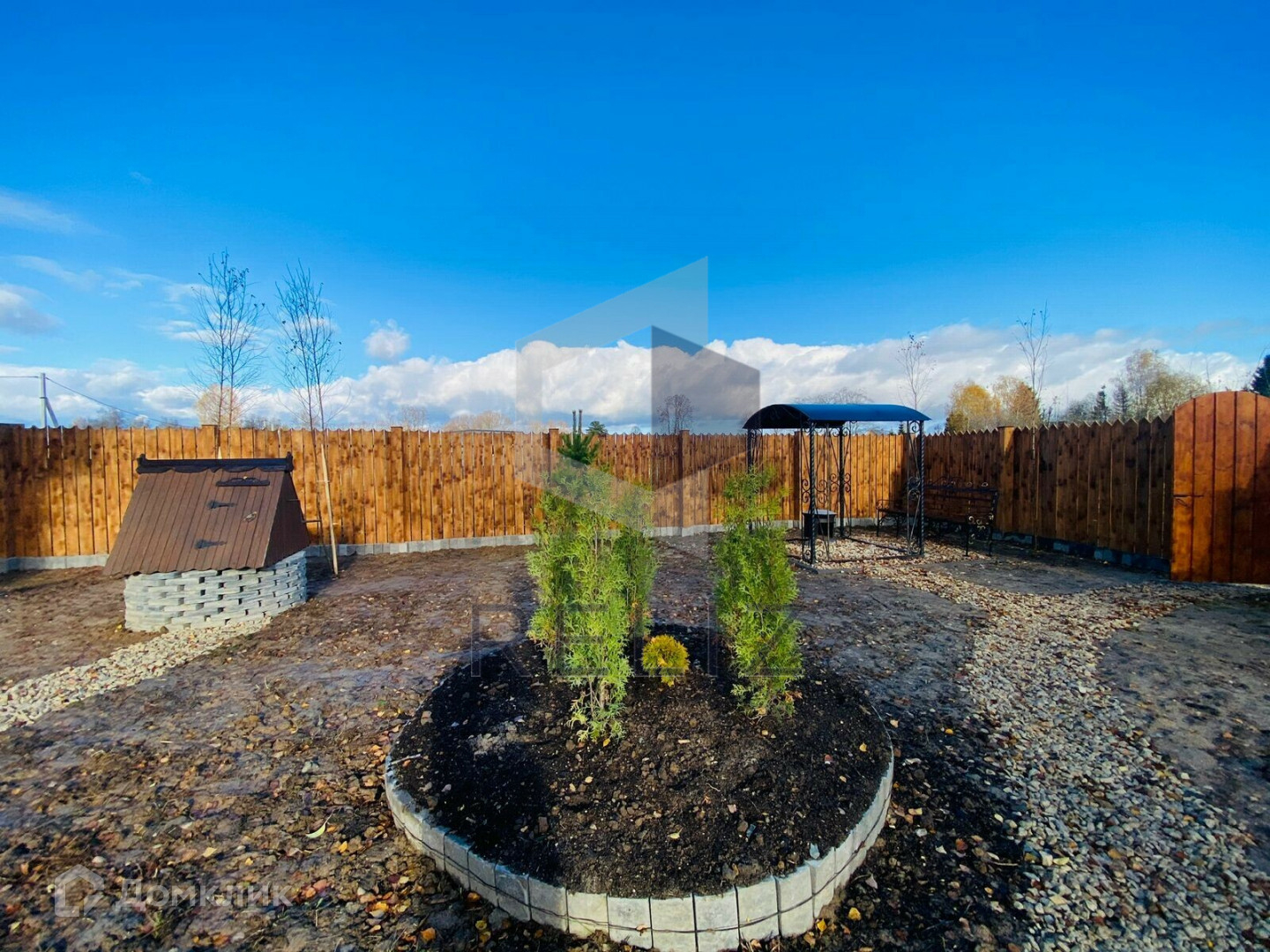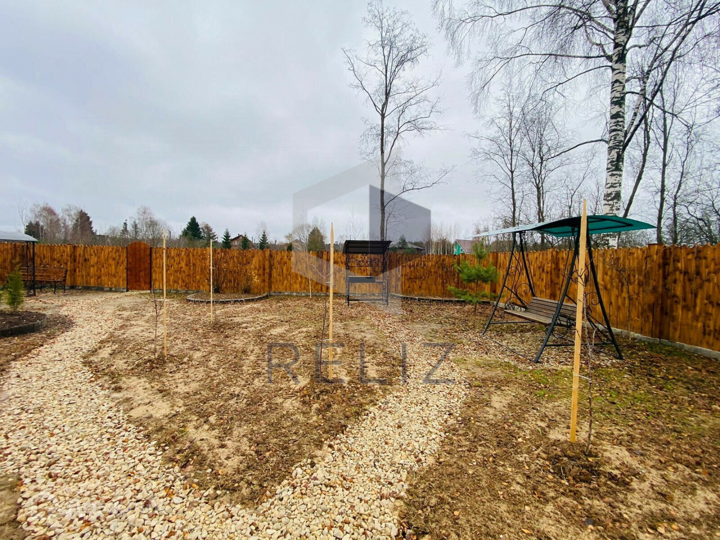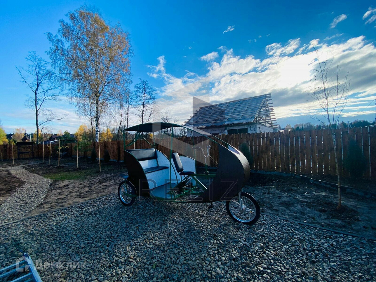 - Оформлены зоны для отдыха и барбекю с качелями, мангалом и беседкой. А также установлен дизайнерский велосипед, который полностью функционирует и может быть использован для перемещения по участку и деревне.