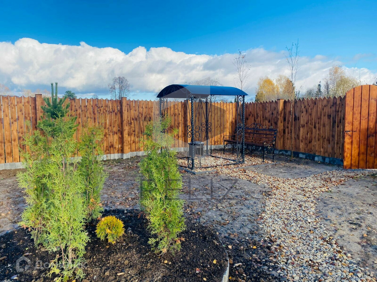 - Сформированы прогулочные дорожки и клумбы. Высажены декоративные деревья и кустарники;