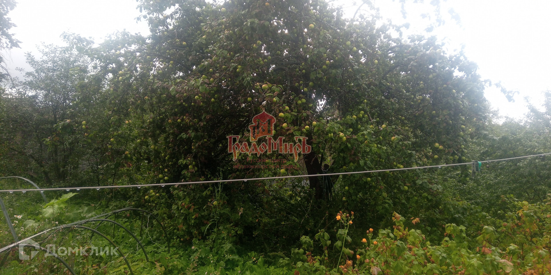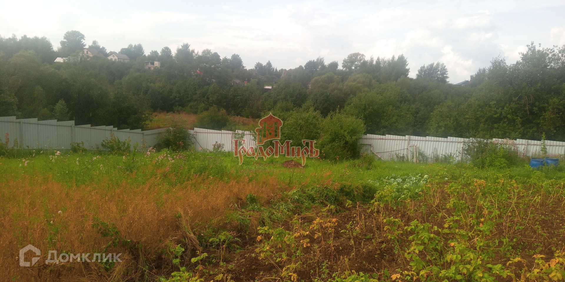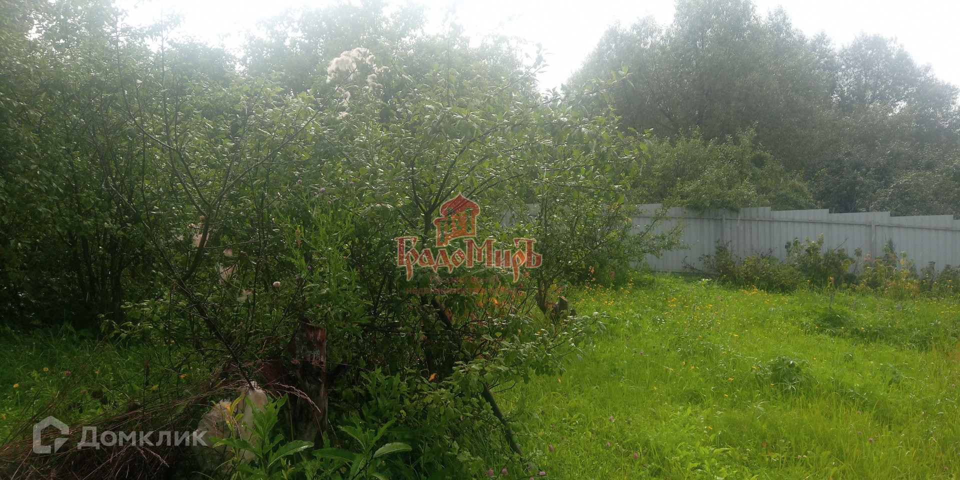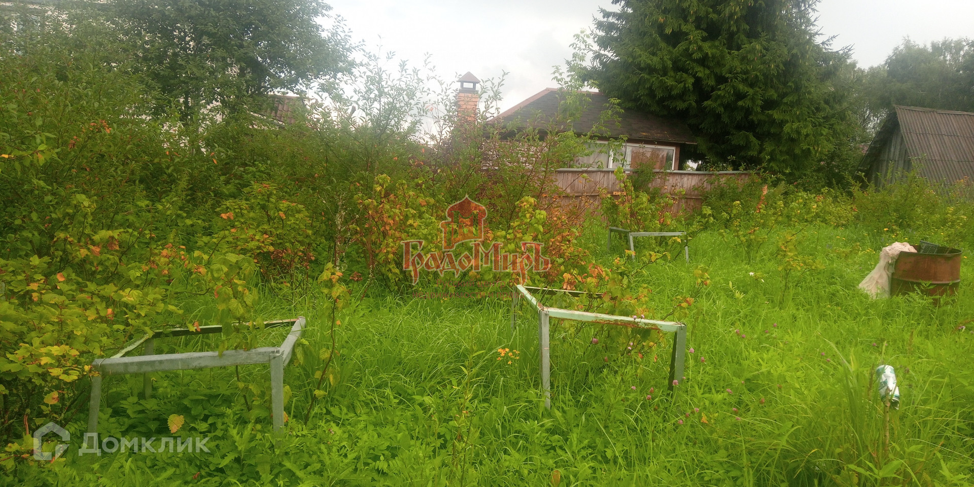 Участок имеет форму трапеции, ухоженный, с уклоном и огорожен забором.(сетка+профлист+штакетник). На участке много плодово-ягодных растений: Яблони, груши, сливы, вишня, смородина и т.д.,а  также есть грядки с разными овощами. Есть калитка с другой стороны участка.
