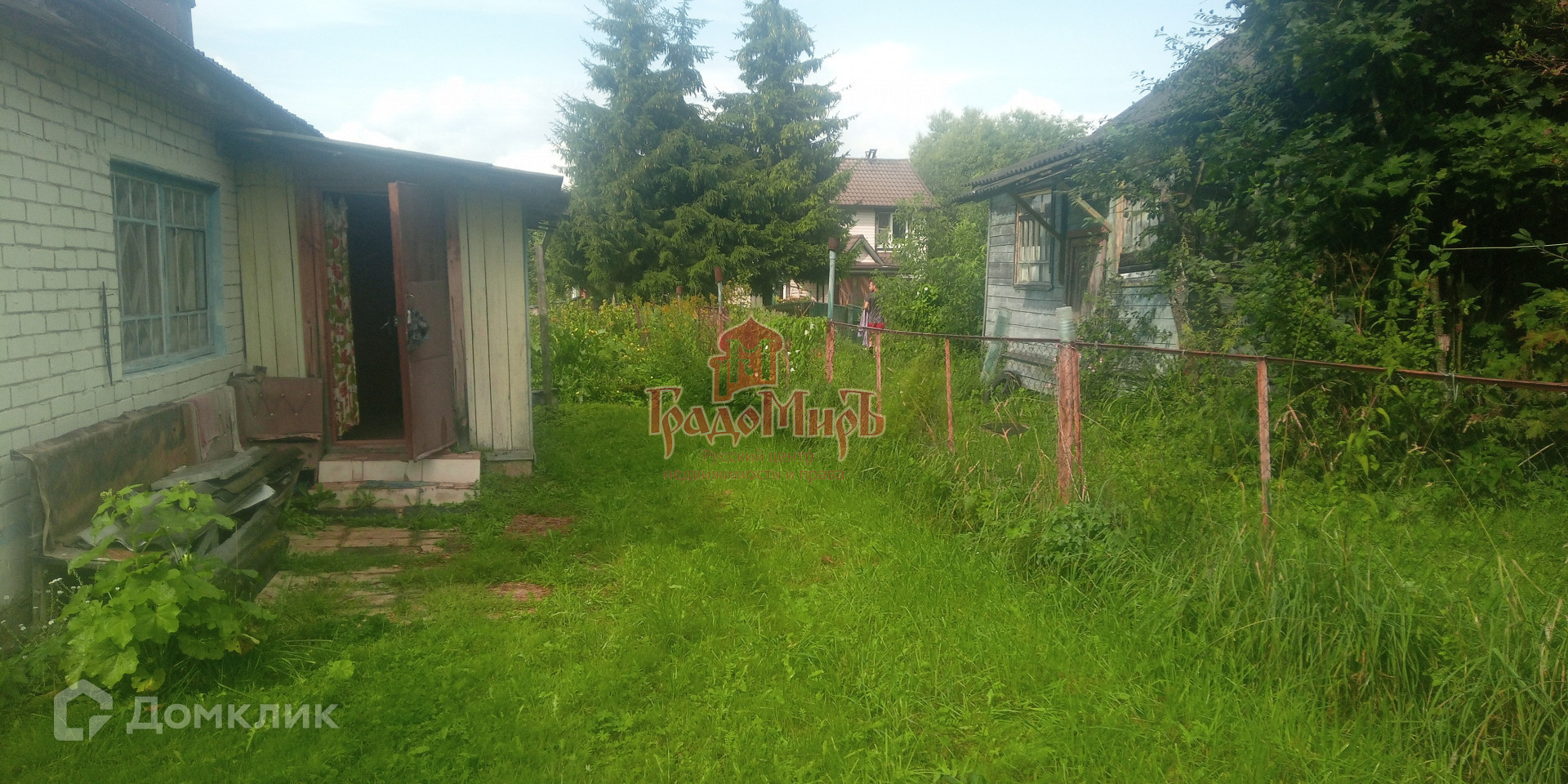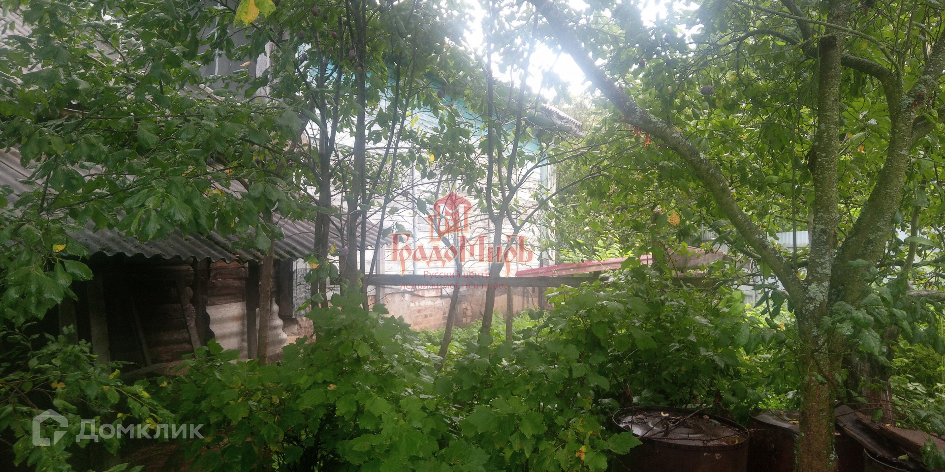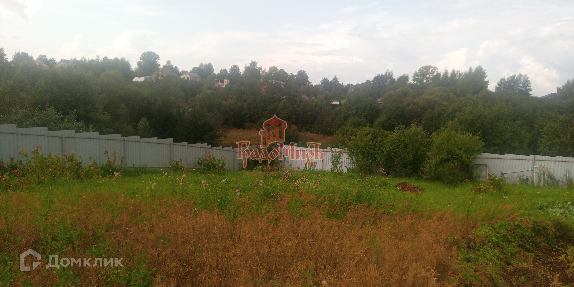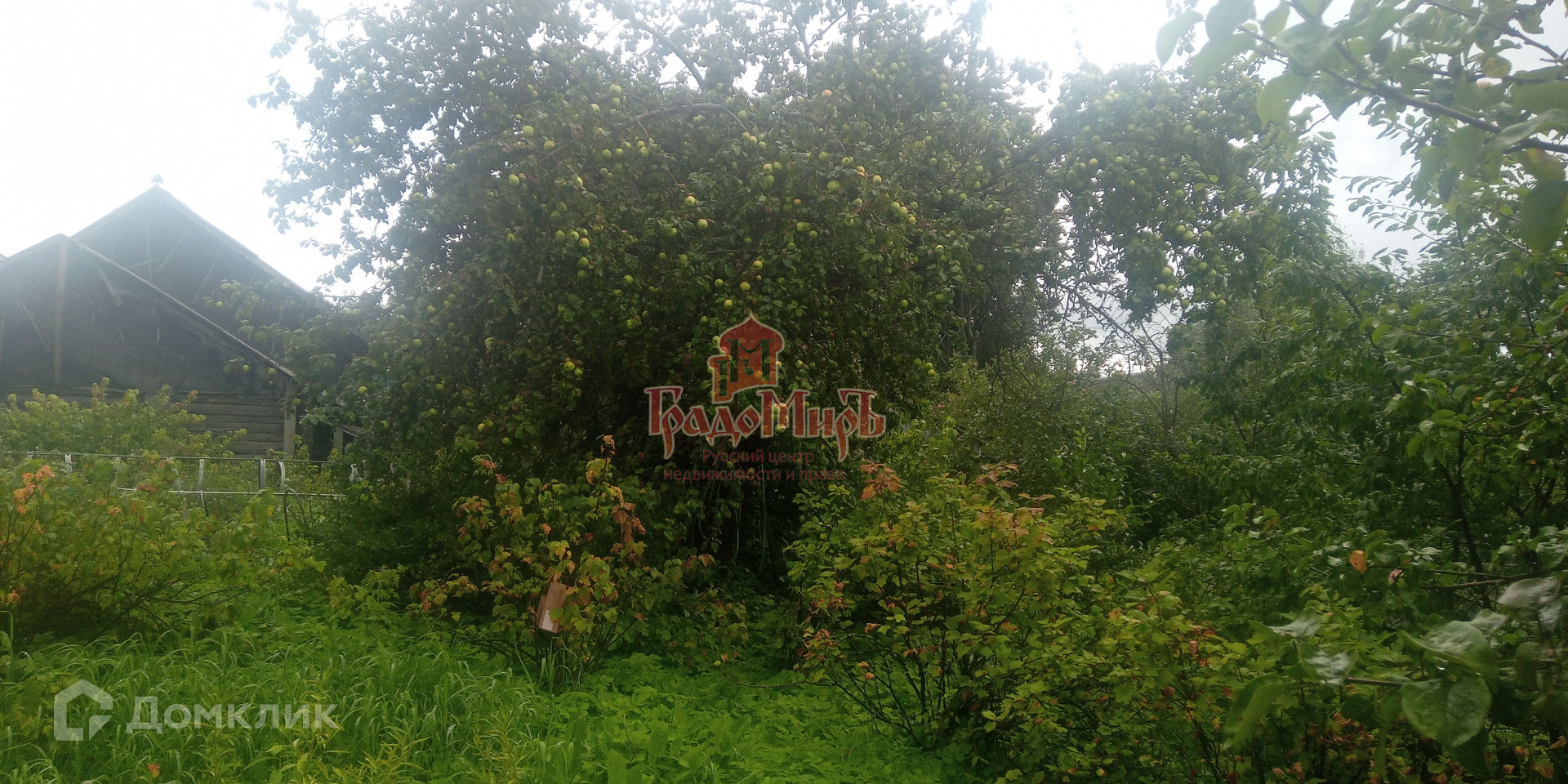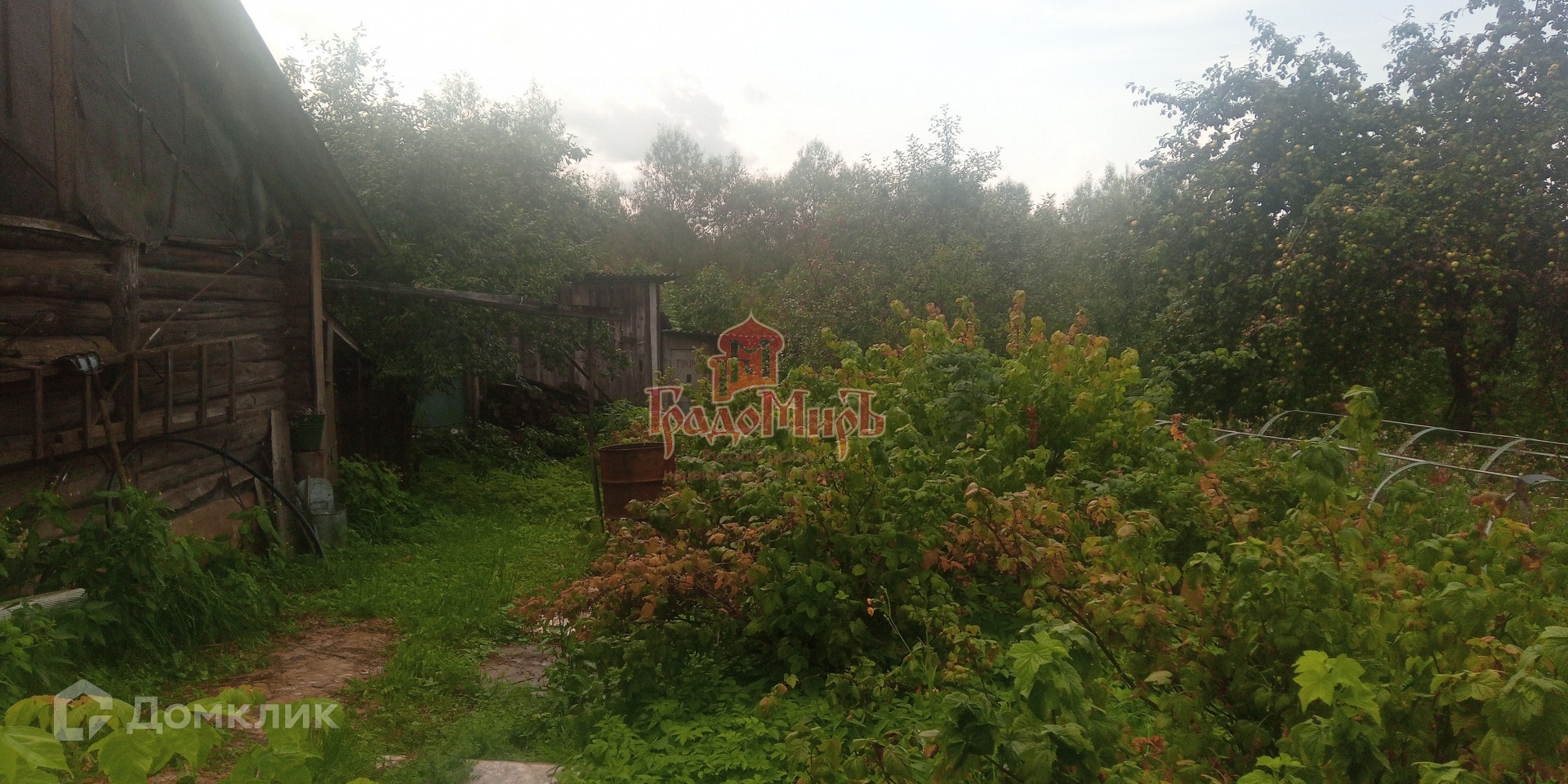 Участок имеет форму трапеции, ухоженный, с уклоном и огорожен забором.(сетка+профлист+штакетник). На участке много плодово-ягодных растений: Яблони, груши, сливы, вишня, смородина и т.д.,а  также есть грядки с разными овощами. Есть калитка с другой стороны участка.