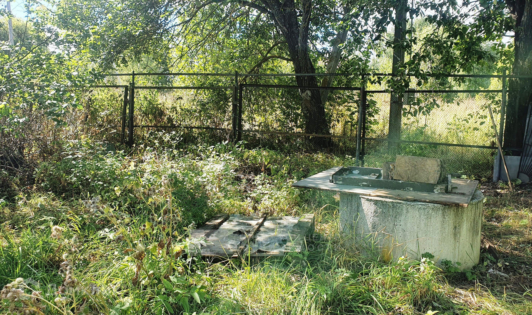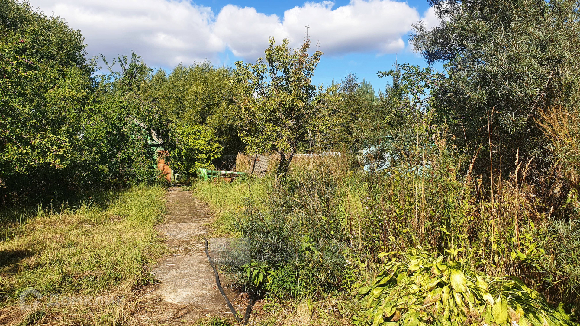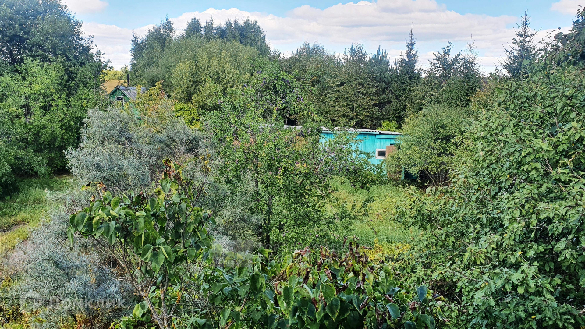 На участке множество взрослых плодовых деревьев и кустарников.