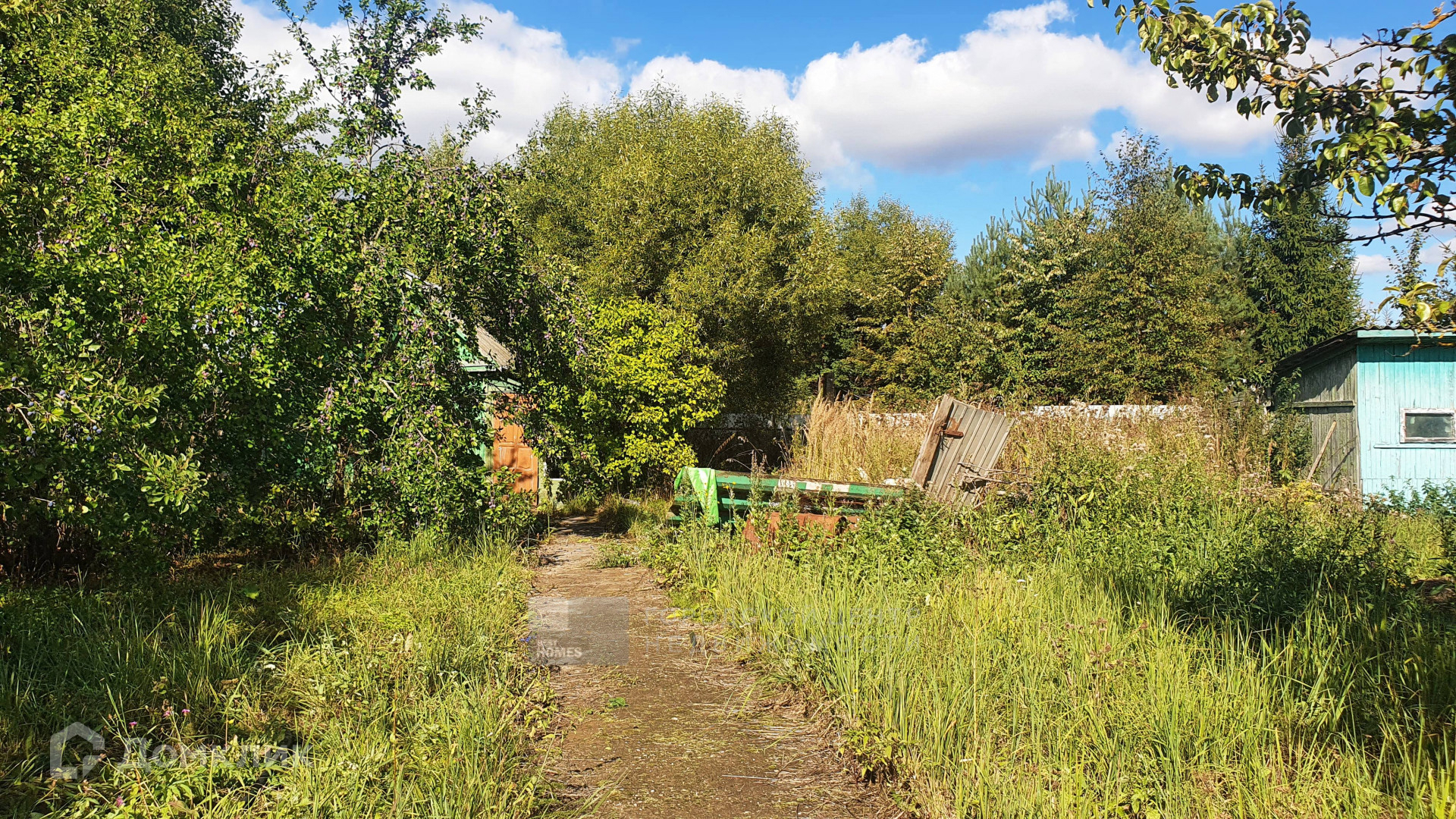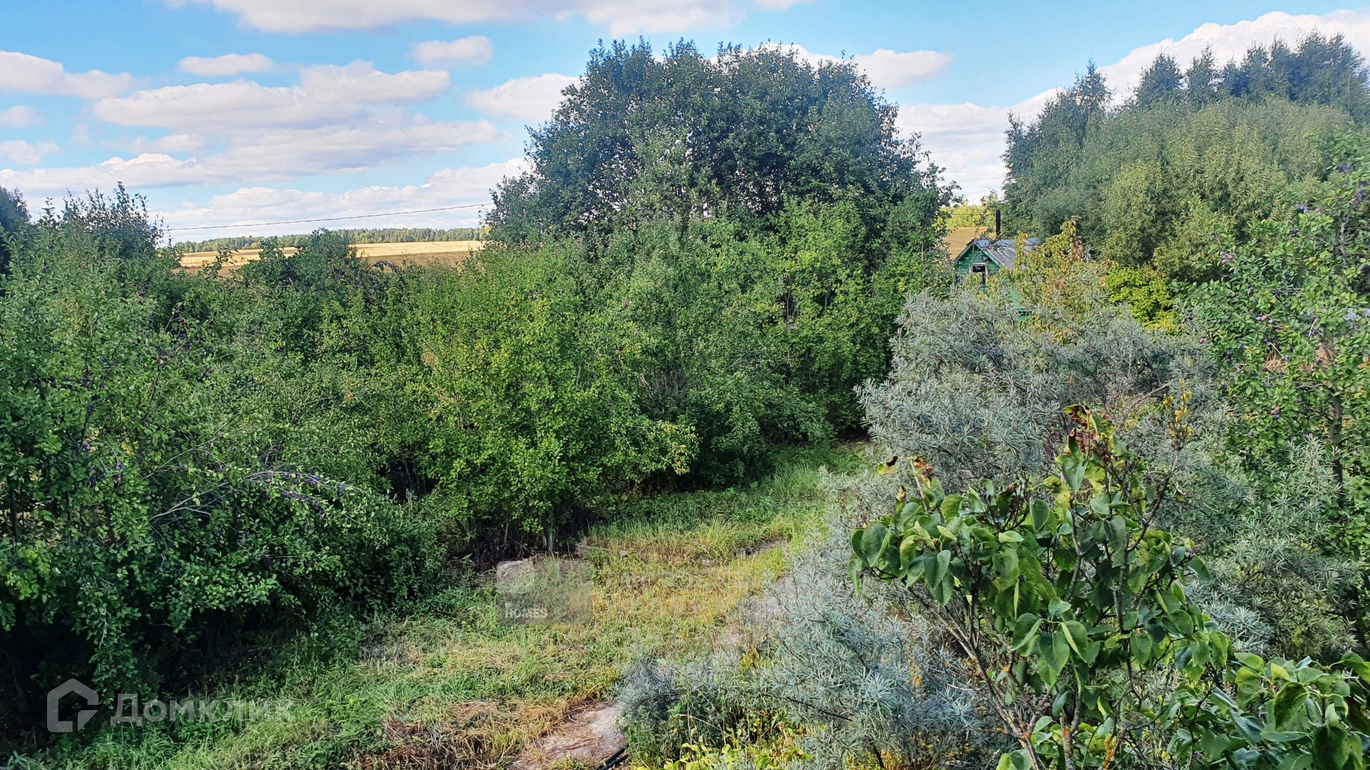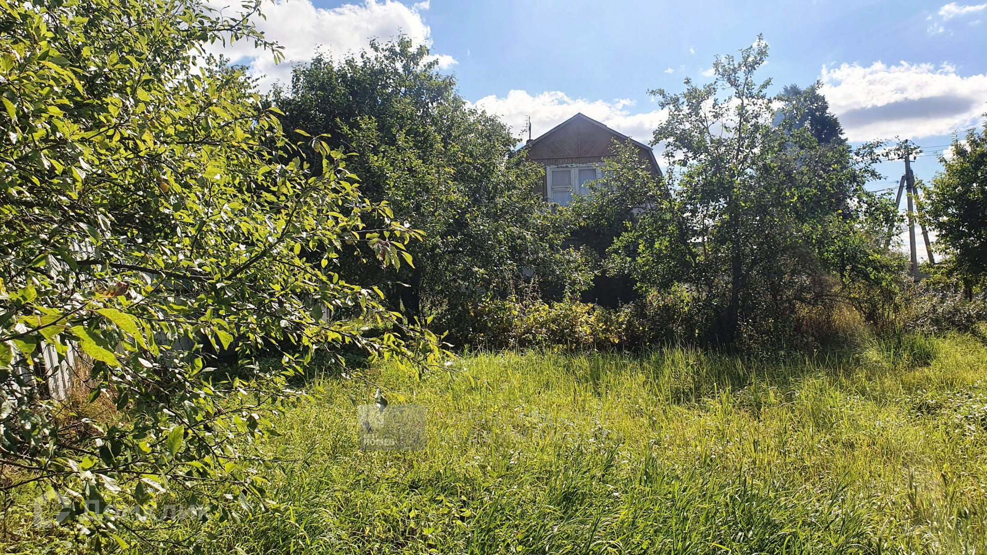 На участке множество взрослых плодовых деревьев и кустарников.