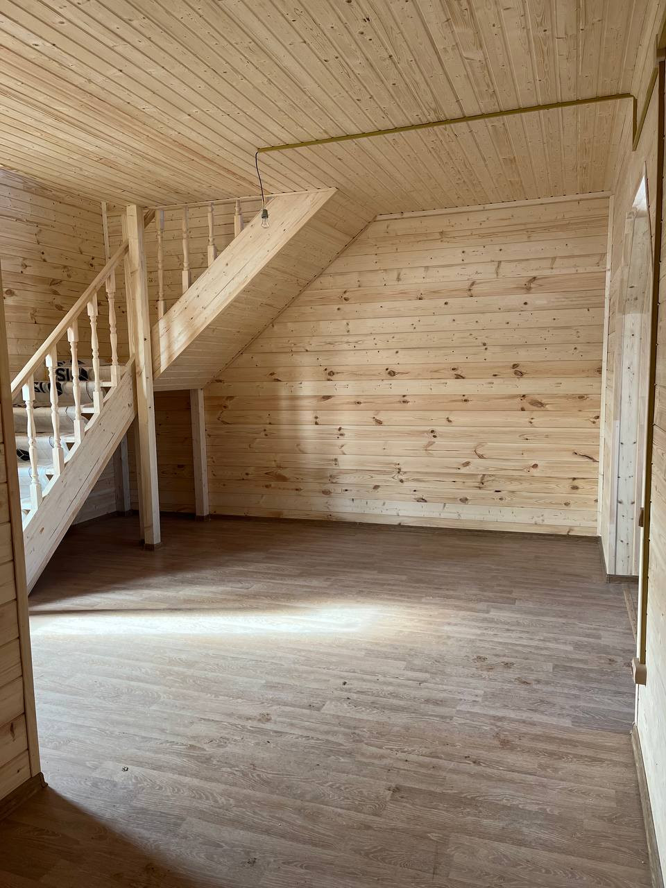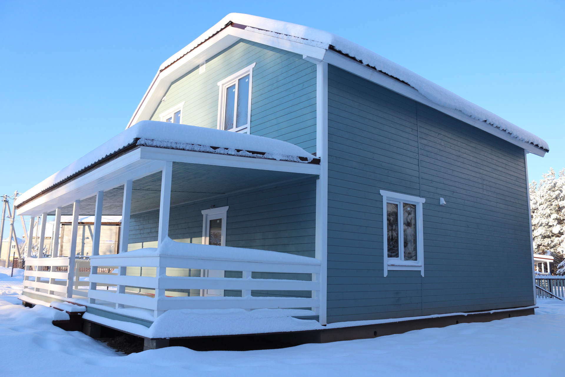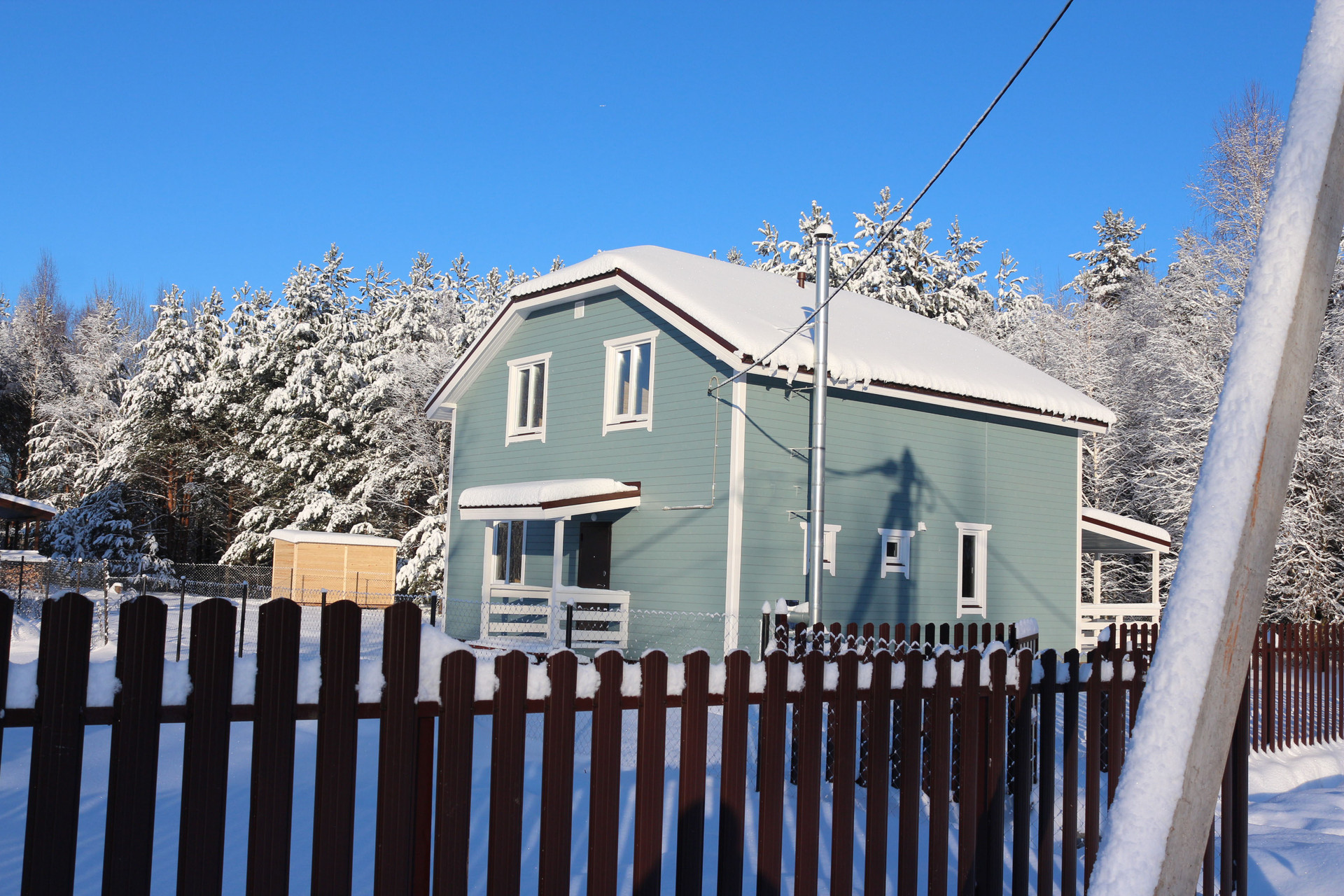 Дом построен по каркасной технологии на ленточном монолитном фундаменте. Стены, пол и потолок утеплены. Древесина обработана специальными составами, защищающими дом от огня и грибка. Крыша покрыта металлочерепицей.