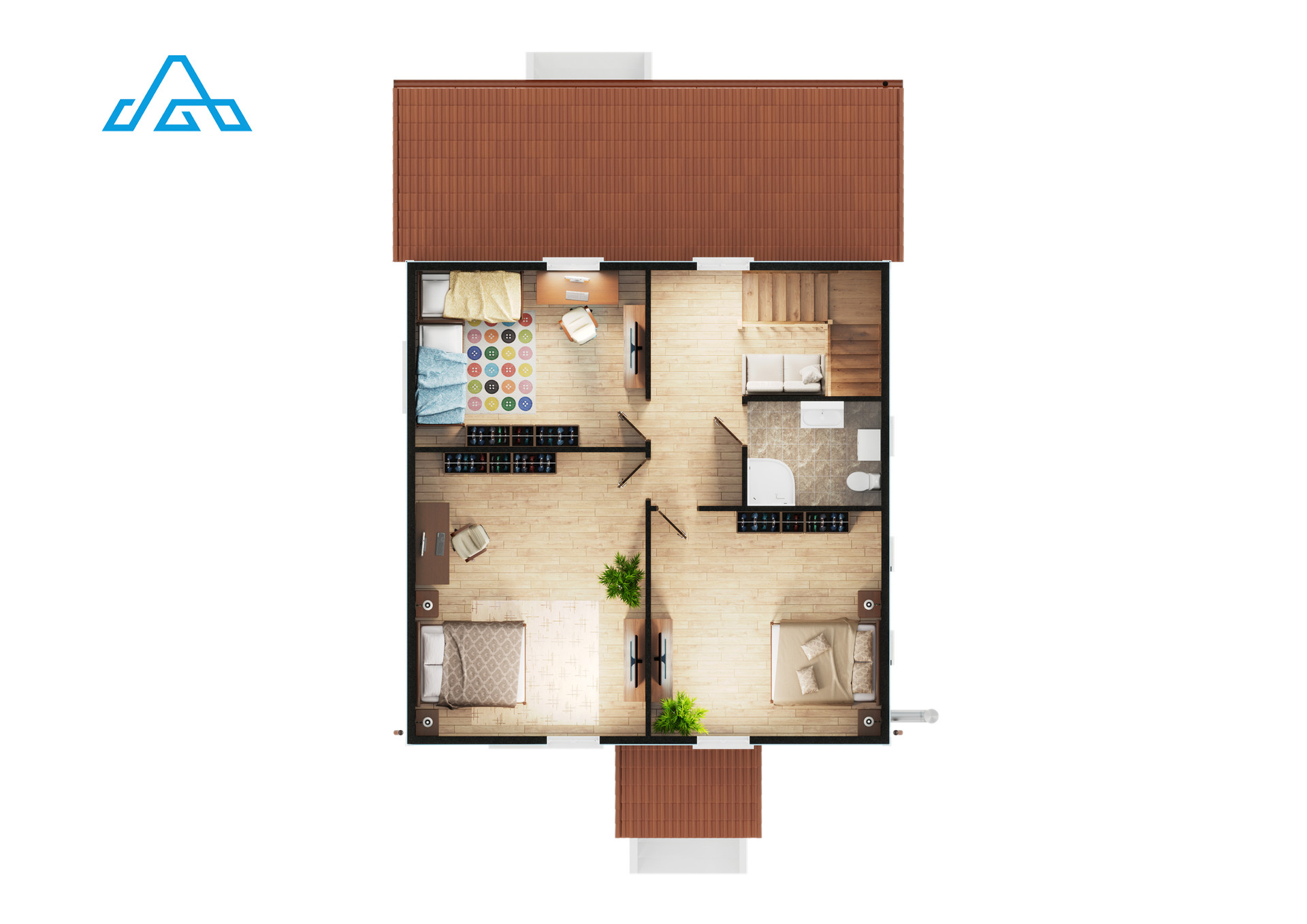 На входе в дом имеется просторная веранда площадью 27 кв. м. На первом этаже - терраса площадью 27 кв. м, кухня - 16 кв. м, холл - 18 кв. м и спальня - 18 кв. м, а также санузел, котельная, холл и тамбур. На втором этаже гостиная - 19 кв. м, три спальни площадью 14 кв. м, 18 кв. м и 22 кв. м и санузел. В доме уже есть все необходимое для комфортного проживания круглый год.