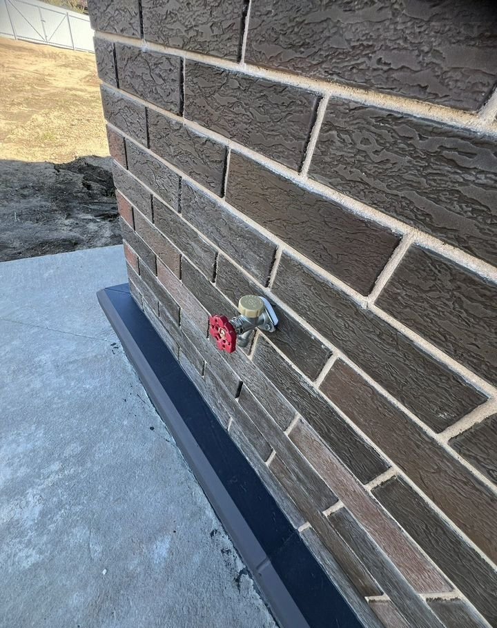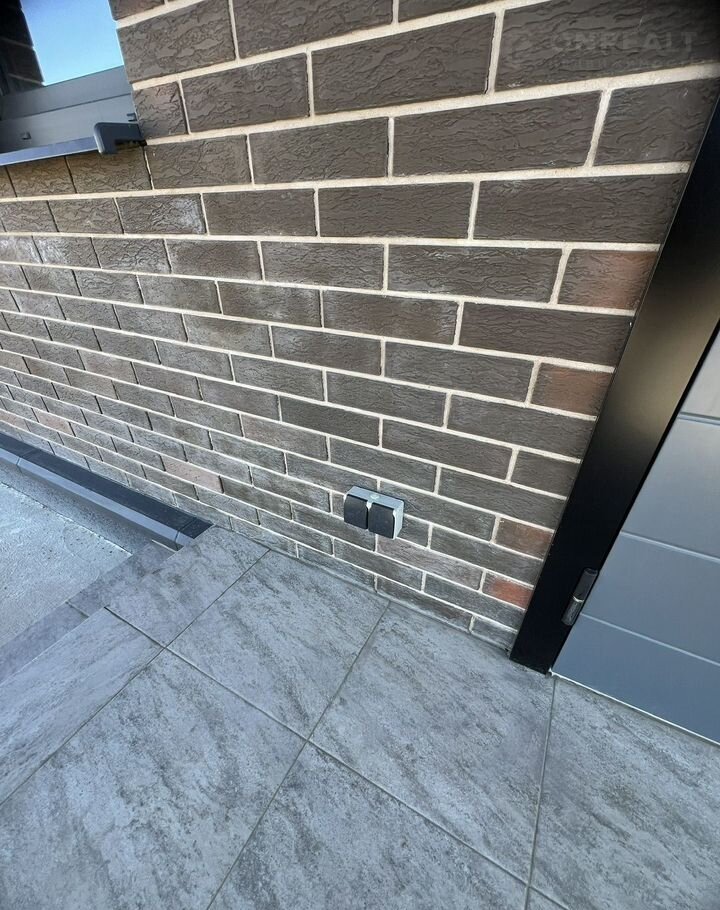 Вокруг дома залита бетонная утепленная отмостка (которая предназначена для защиты фундамента от дождевых вод и паводков). Выведены на фасад дома Освещение в круг, Кран для полива и эл. Розетки.( Очень удобно).
