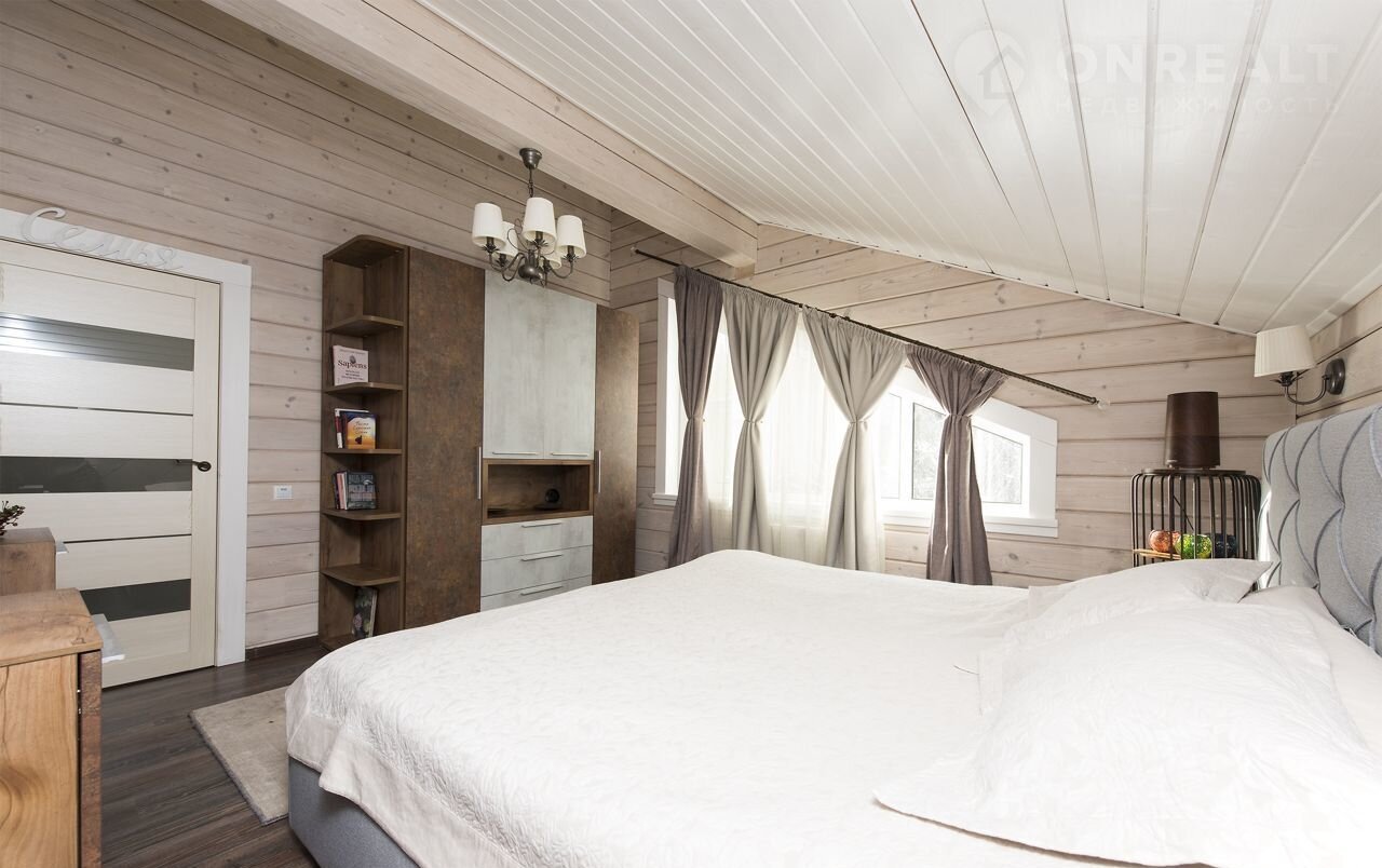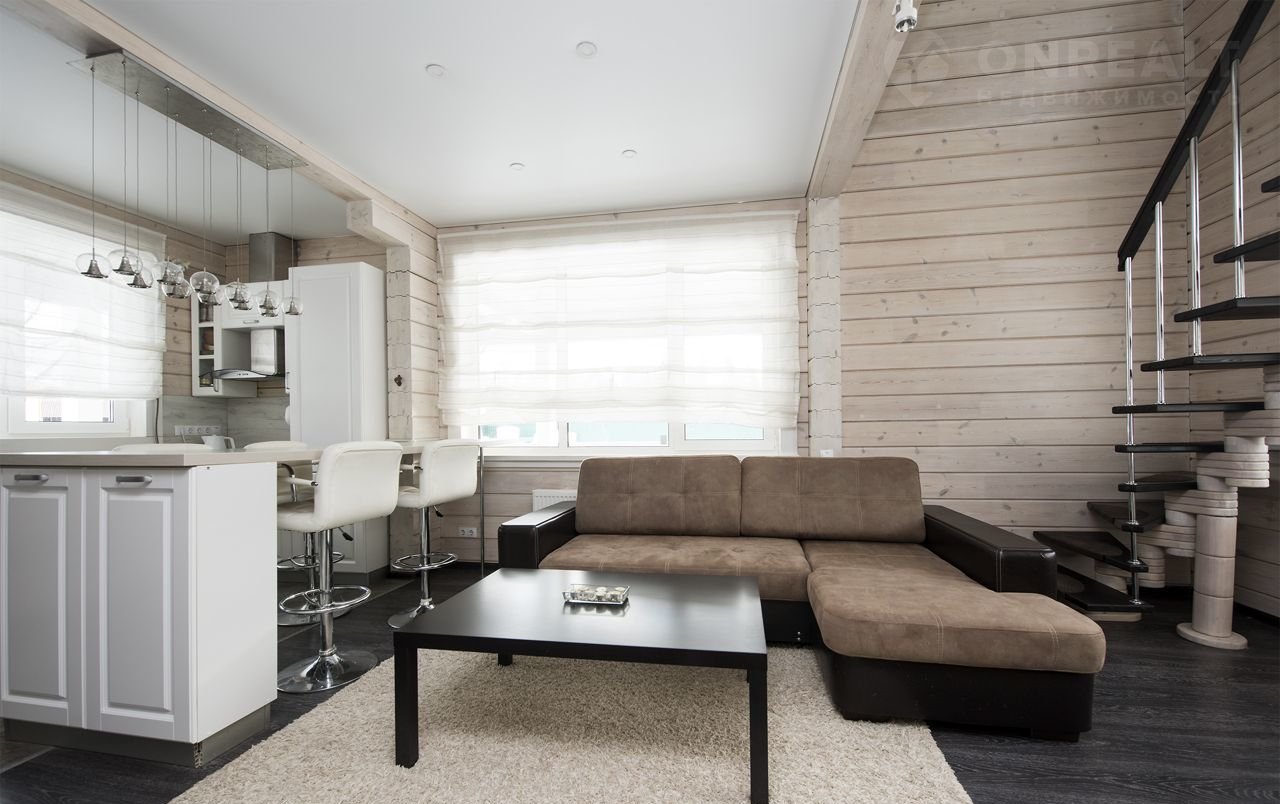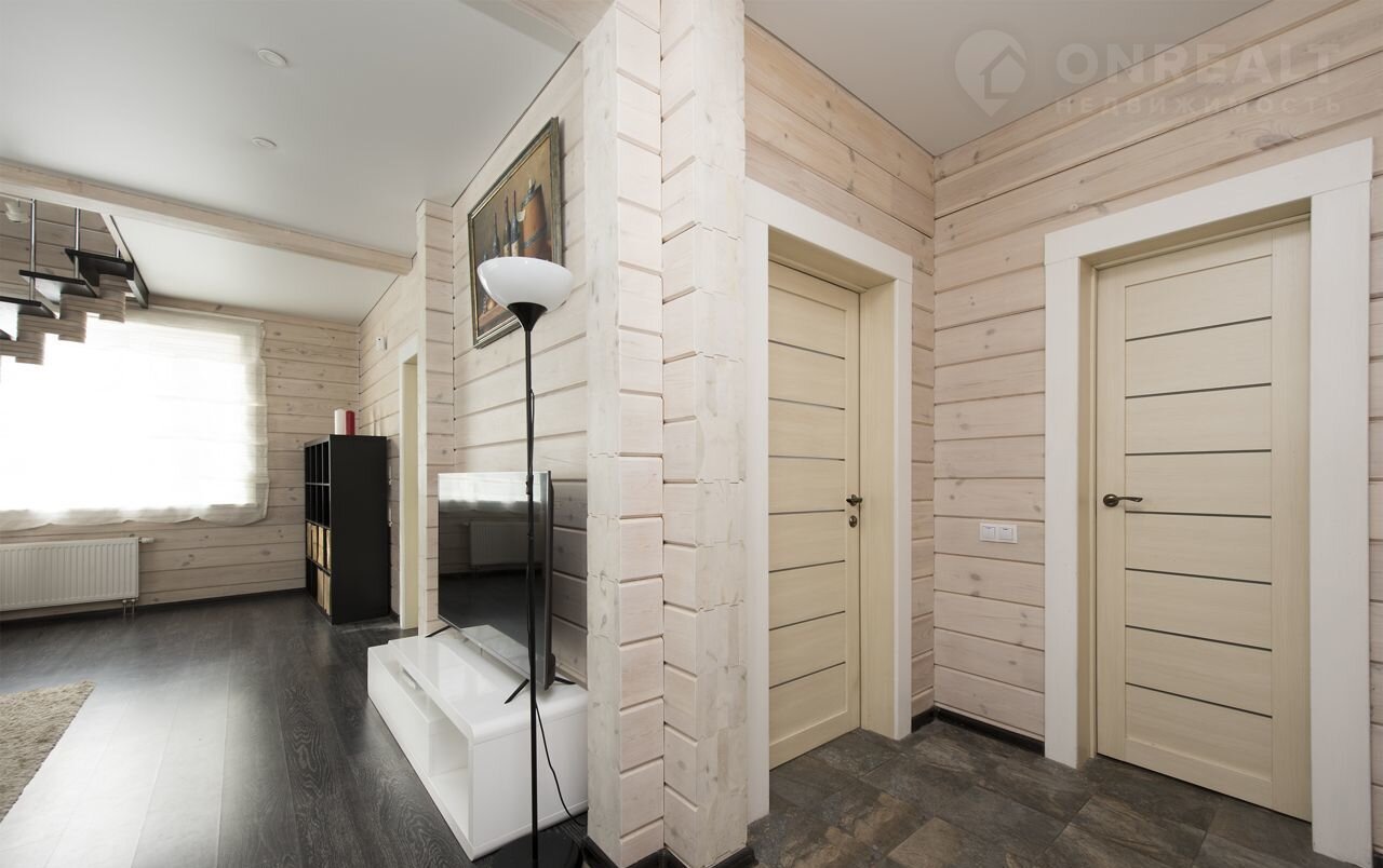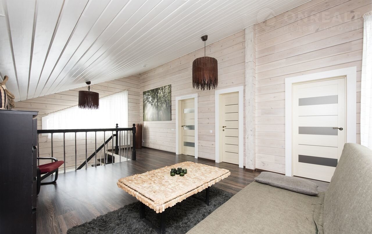 Брус – сосна, сечение: 200 (см) ширина, 180 (см) высота. Межэтажные перекрытия - дерево, окна – ПВХ (2-х камерные), кровля - металлочерепица, окраска дома - Тikkurilа. Фундамент - плита. Террасы – натуральная лиственница. Теплые зоны - 132,6 кв м, холодные зоны - 28,3 кв м.