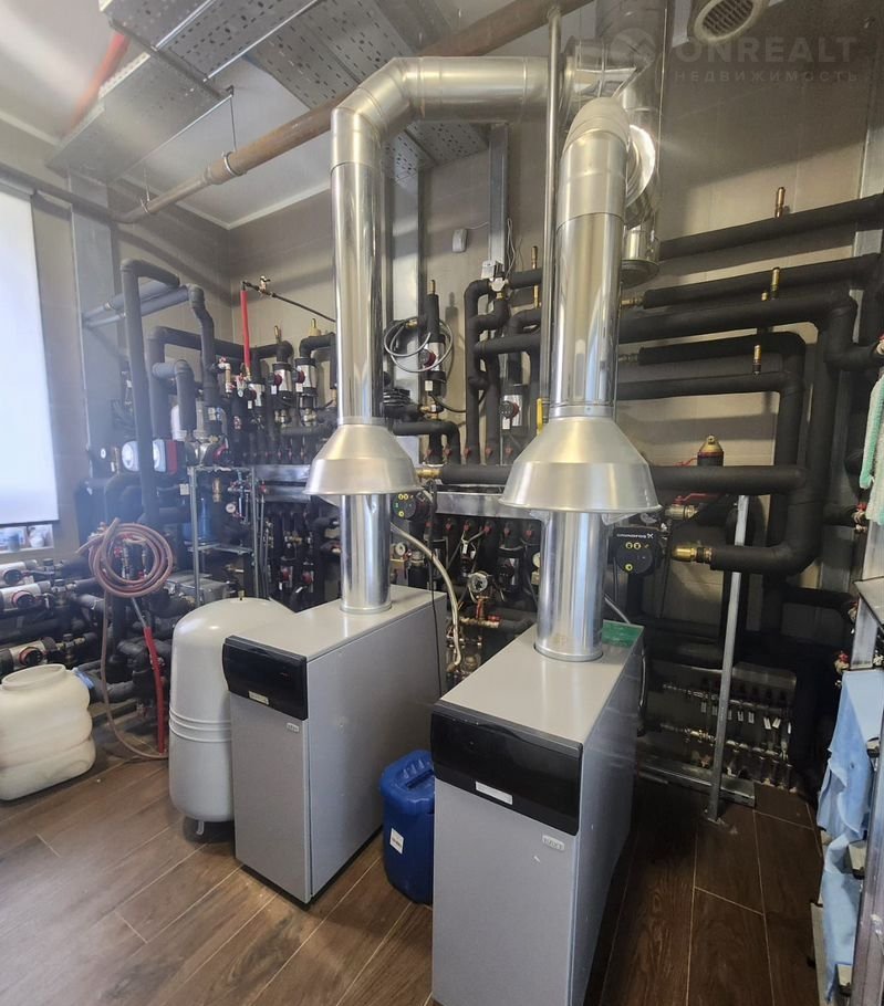 В коттедже - центральные коммуникации: газ, электричество, водоснабжение (есть дублирующие газголдеры и генератор), отопление - котлы