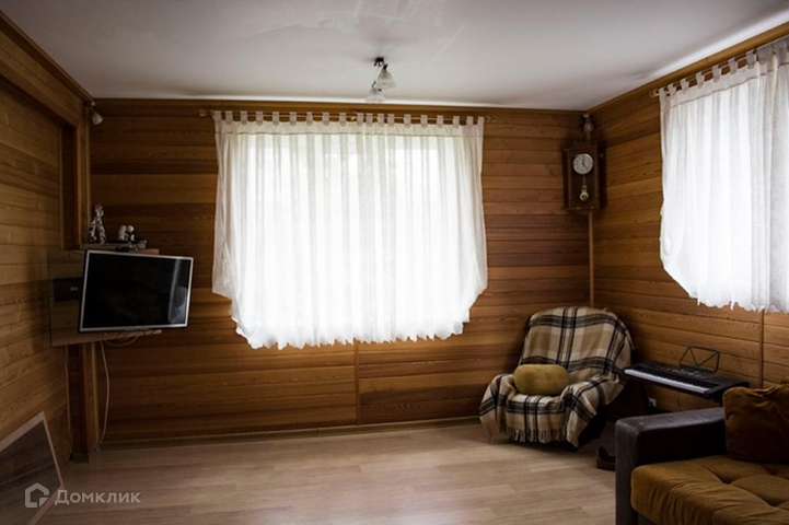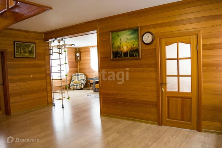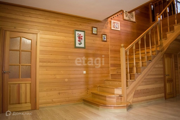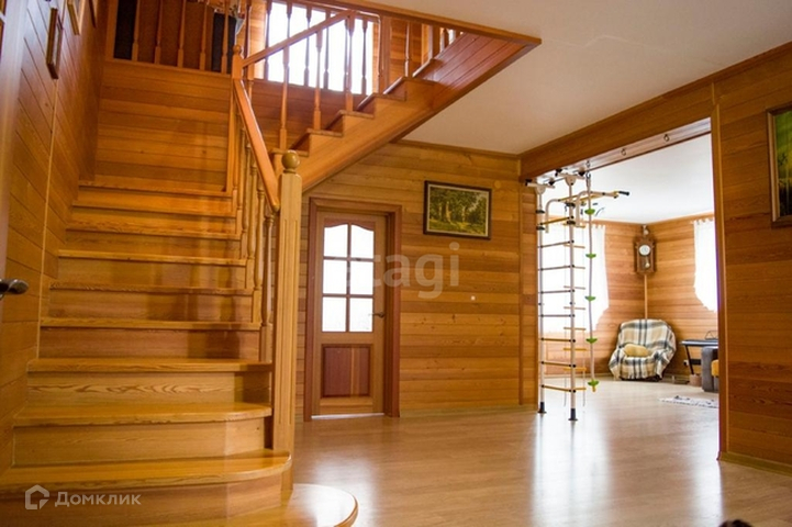 Дом внутри обшит лиственницой, межкомнатные двери, лестница из массива, отопление проведено через пол.
