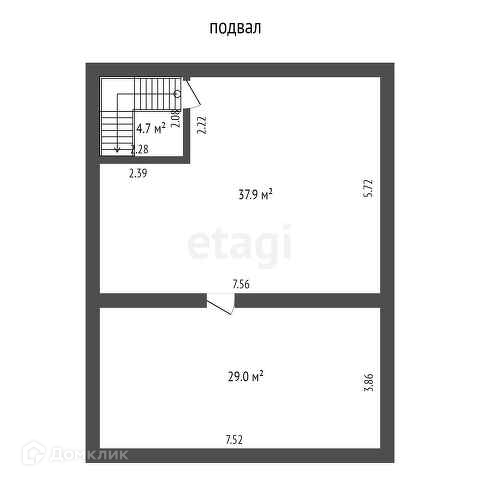- В подвале расположены 2 секции - 37,9 кв.м и 29 кв.м.